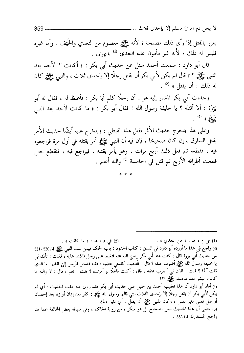 يُعَزِّرَ بالقتل إذا رأى ذلك مصلحةً؛ لأنَّه - صلى الله عليه وسلم - معصوم من التعدِّي والحَيْفِ، وأما غيرُه فليس لهُ ذَلِكَ؛ لأنَّه غير مأمون عليهِ التعدِّي بالهوى. قالَ أبو داود: سمعتُ أحمد سُئِلَ عن حديث أبي بكر ما كانت لأحدٍ بعد النَّبيِّ - صلى الله عليه وسلم -، قال: لم يكن لأبي بكر أنْ يقتل رجلاً إلا بإحدى ثلاثٍ (¬1) ،