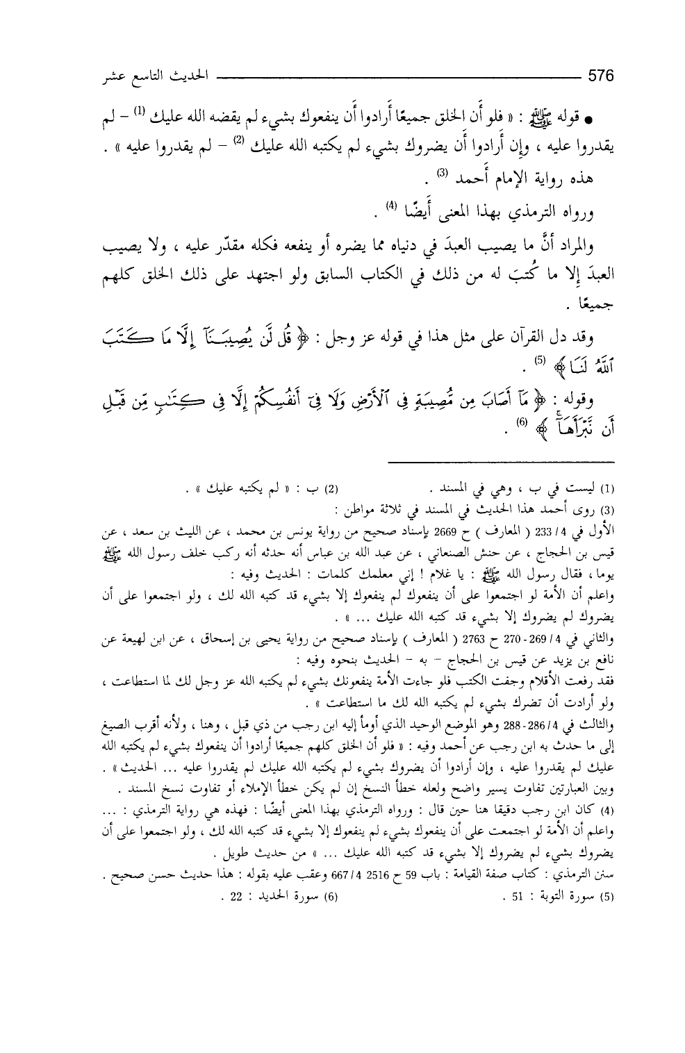 قوله - صلى الله عليه وسلم -: ((فلو أنَّ الخلق جميعاً أرادوا أنْ ينفعوك بشيء لم يقضِهِ الله، لم يقدِرُوا عليه، وإنْ أرادوا أنْ يضرُّوك بشيءٍ لم يكتبه الله عليك، لم يقدروا عليه)) .