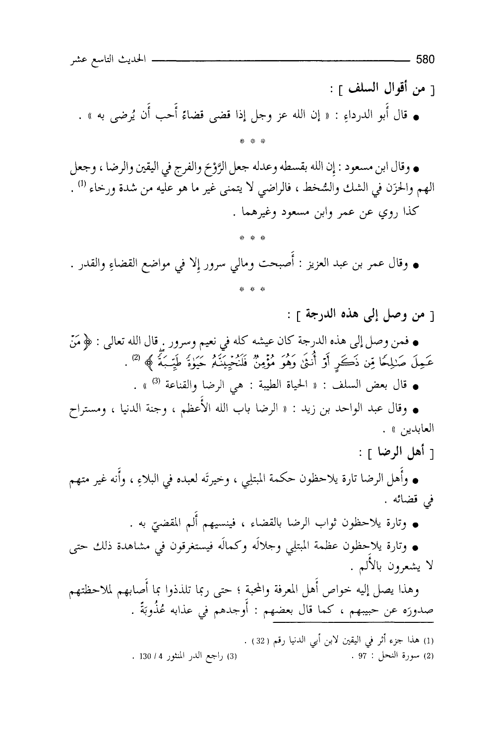 {مَنْ عَمِلَ صَالِحاً مِنْ ذَكَرٍ أَوْ أُنْثَى وَهُوَ مُؤْمِنٌ فَلَنُحْيِيَنَّهُ حَيَاةً طَيِّبَةً} (¬3) قال بعض السَّلف: الحياة الطيبة: هي الرضا والقناعة (¬4) . وقال عبد الواحد بن زيد: الرضا باب الله الأعظم وجنة الدنيا ومستراح العابدين (¬5) .