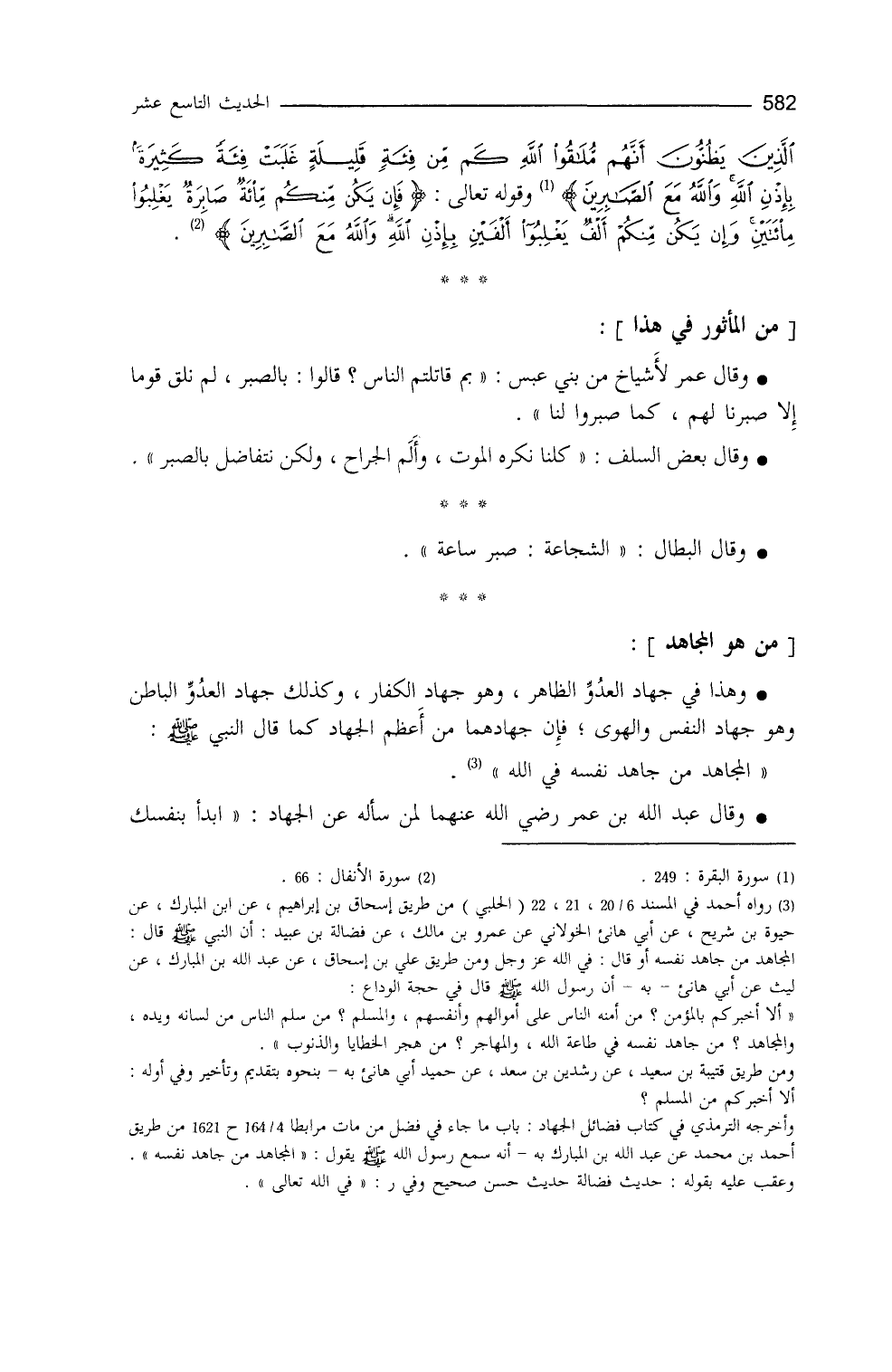 الصَّابِرِينَ} (¬1) ، وقوله تعالى: {فَإِنْ يَكُنْ مِنْكُمْ مِئَةٌ صَابِرَةٌ يَغْلِبُوا مِئَتَيْنِ وَإِنْ يَكُنْ مِنْكُمْ أَلْفٌ يَغْلِبُوا أَلْفَيْنِ بِإِذْنِ اللهِ وَاللهُ مَعَ الصَّابِرِينَ} (¬2) . وقال عمرُ لأشياخ من بني عبس: بم قاتلتُمُ الناس؟ قالوا: بالصبر، لم نلق قوماً إلا صبرنا لهم كما صبروا لنا. وقال بعض السَّلف: كلنا يكره الموت وألم الجراح، ولكن نتفاضل بالصَّبر. وقال البطَّال (¬3) :