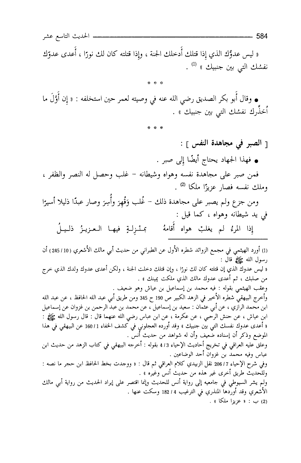 ((ليس عدوُّك الذي إذا قتلك أدخلك الجنة، وإذا قتلته كان لك نوراً، أعدى عدوِّك نفسك التي بين جنبيك)) (¬1) .