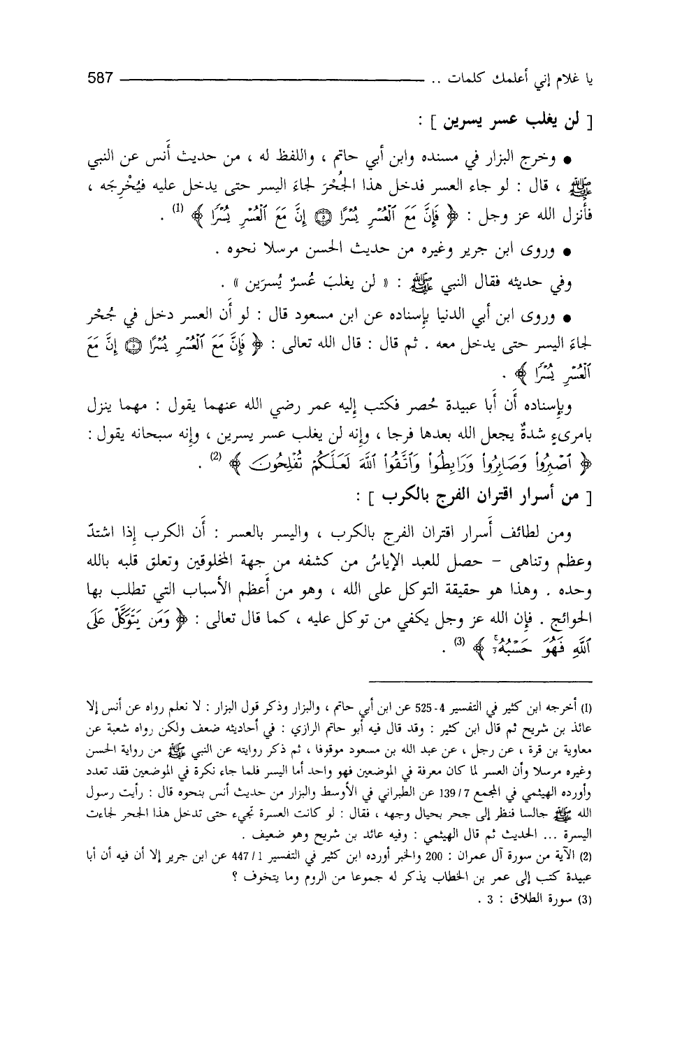 وروى ابن أبي الدنيا بإسناده عن ابن مسعود قال: لو أنَّ العسر دخل في جُحر لجاء اليسر حتى يدخل معه، ثُمَّ قال: قال الله تعالى: {فَإِنَّ مَعَ الْعُسْرِ يُسْراً إِنَّ مَعَ الْعُسْرِ يُسْراً} (¬5) . وبإسناده أنَّ أبا عبيدة حُصِرَ فكتب إليه عمرُ يقول: مهما ينْزل بامرئٍ شدَّةٌ يجعل الله بعدها فرجاً، وإنَّه لن يَغلِبَ عسرٌ يُسرين (¬6) ، وإنَّه يقول: