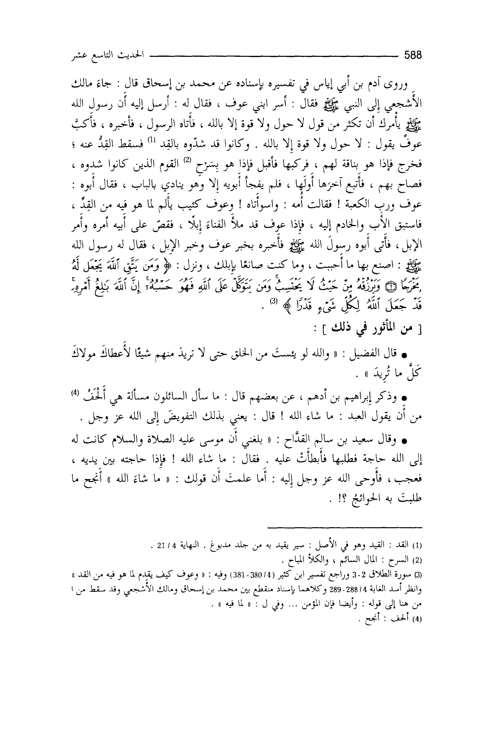 رسول الله - صلى الله عليه وسلم - يأمُرُكَ أنْ تُكثِرَ من قول: لا حول ولا قوَّةَ إلا بالله، فأتاه الرسول فأخبره، فأكبَّ عوفٌ يقول: لا حولَ ولا قوَّةَ إلاَّ بالله، وكانوا قد شدُّوه بالقِدِّ فسقط القِدُّ عنه، فخرج فإذا هو بناقةٍ لهم فركبها، فأقبل فإذا هو بسَرحِ القوم الذين كانوا شدُّوه، فصاح بهم، فاتبع آخرُها أوَّلها، فلم يفاجأ أبويه إلاّ وهو ينادي بالباب، فقال أبوه (¬1) : عوفٌ وربِّ الكعبة، فقالت أمه: واسوأتاه (¬2) ، وعوف كئيب يألم ما فيه مِنَ القدِّ، فاستبقَ الأبُ والخادمُ إليه، فإذا عوفٌ قد ملأ الفناء إبلاً، فقصَّ على أبيه أمرَه وأمرَ الإبل، فأتى أبوهُ رسولَ الله - صلى الله عليه وسلم -، فأخبره بخبرِ عوفٍ وخبرِ الإبل، فقال له رسول الله - صلى الله عليه وسلم -: ((اصنع بها ما أحببتَ، وما كنت صانعاً بإبلك)) (¬3) ، ونزل: {وَمَنْ يَتَّقِ اللهَ يَجْعَلْ لَهُ مَخْرَجاً وَيَرْزُقْهُ مِنْ حَيْثُ لا يَحْتَسِبُ وَمَنْ يَتَوَكَّلْ عَلَى اللهِ فَهُوَ حَسْبُهُ} (¬4) الآية.
