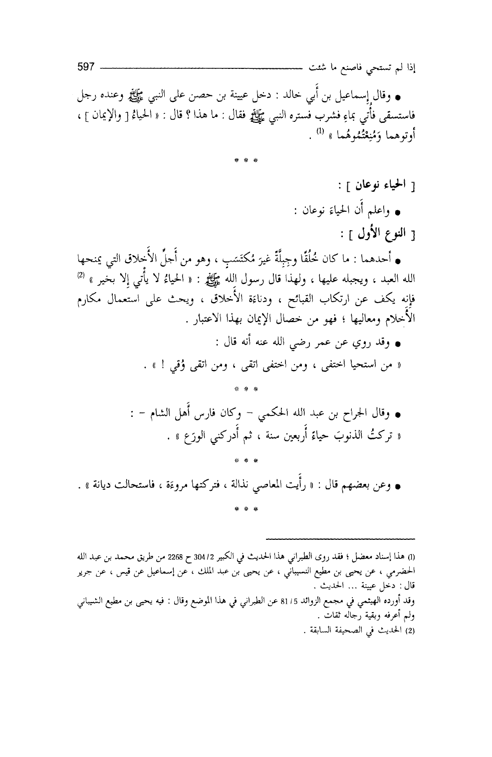 أحدهما: ما كان خَلْقاً وجِبِلَّةً غيرَ مكتسب، وهو من أجلِّ الأخلاق التي يَمْنَحُها الله العبدَ ويَجبِلُه عليها، ولهذا قال - صلى الله عليه وسلم -: ((الحياء لا يأتي إلاَّ بخير)) ، فإنَّه يكفُّ عن ارتكاب القبائح ودناءةِ الأخلاق، ويحثُّ على استعمال مكارم الأخلاق ومعاليها، فهو مِنْ خصال الإيمان بهذا الاعتبار، وقد روي عن عمر - رضي الله عنه - أنَّه قال: من استحيى اختفى، ومن اختفى اتقى، ومن اتقى وُقي.