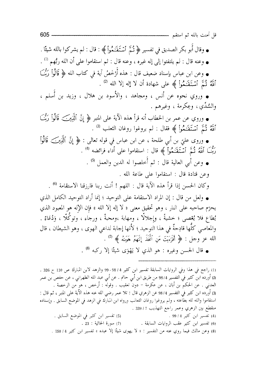 وقال أبو بكر الصديق في تفسير {ثُمَّ اسْتَقَامُوا} قال: لم يشركُوا بالله شيئاً. وعنه قال: لم يلتفتوا إلى إله غيره. وعنه قال: ثم استقاموا على أنَّ الله رَبُّهم (¬1) .