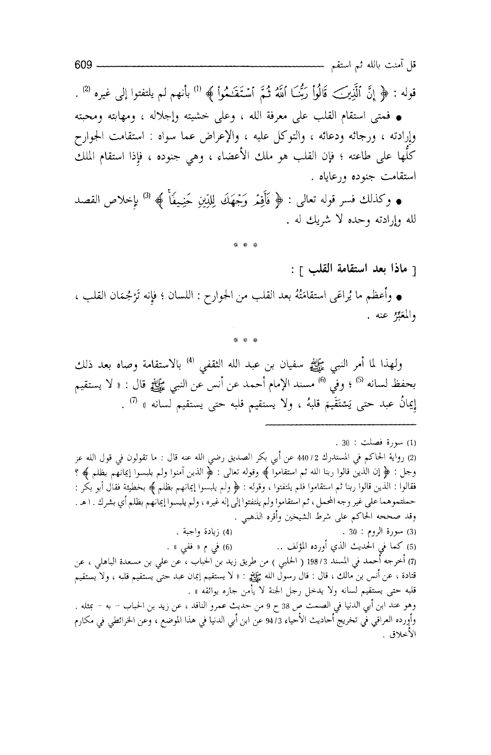 " مسند الإمام أحمد " (¬3) عن أنس، عن النَّبيِّ - صلى الله عليه وسلم -، قال: ((لا يستقيمُ إيمانُ عبدٍ حتَّى يستقيم قلبُه، ولا يستقيمُ قلبُه حتى يستقيمَ لسانُه)) .