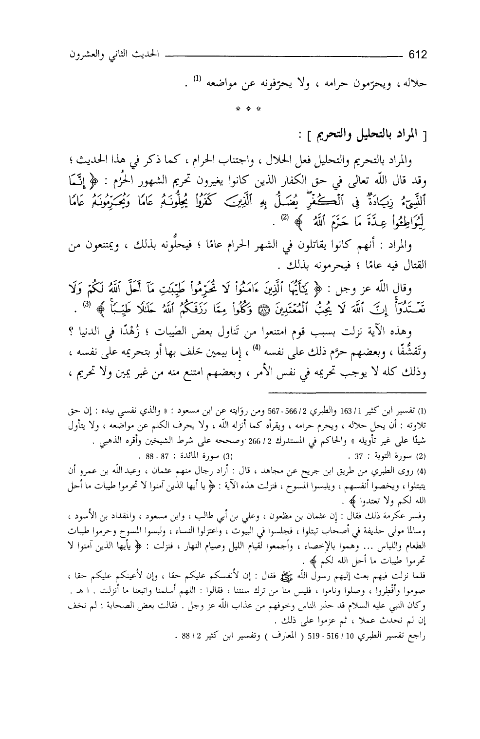 والمرادُ بالتحليل والتحريم: فعلُ الحلال واجتنابُ الحرام كما ذُكر في هذا الحديث. وقد قال الله تعالى في حقِّ الكفار الذين كانوا يُغيرون تحريمَ الشُّهور الحُرُم: {إِنَّمَا النَّسِيءُ زِيَادَةٌ فِي الْكُفْرِ يُضَلُّ بِهِ الَّذِينَ كَفَرُوا يُحِلُّونَهُ عَاماً وَيُحَرِّمُونَهُ عَاماً لِيُوَاطِئُوا عِدَّةَ مَا حَرَّمَ اللهُ فَيُحِلُّوا مَا حَرَّمَ اللهُ} (¬2) ، والمراد: أنَّهم كانوا يُقاتلون في الشهر الحرام عاماً، فيُحلونه بذلك، ويمتنعون من القتال فيه عاماً، فيحرِّمونَهُ بذلك (¬3) .