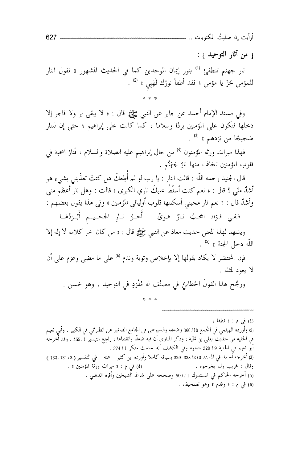 نارُ جهنَّم تنطفىء بنور إيمان الموحدين، كما في الحديث المشهور: ((تقول النار للمؤمن: جُزْ يا مؤمنُ، فقد أطفأ نورُك لهبي)) (¬1) .