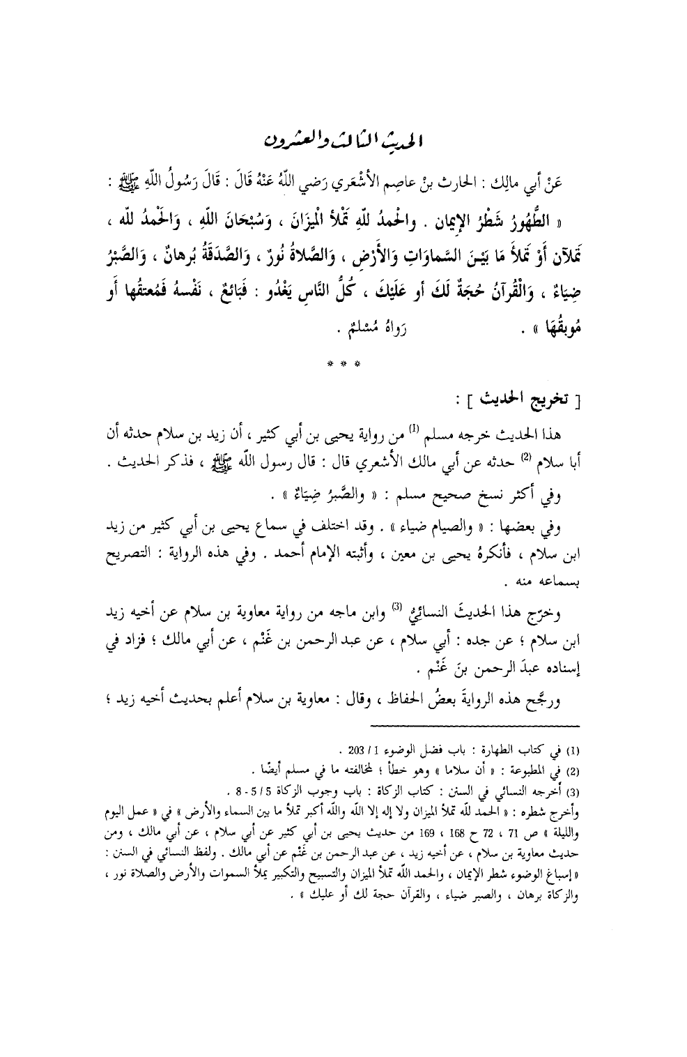 هذا الحديث خرَّجه مسلم (¬1) من رواية يحيى بن أبي كثير: أنَّ زيدَ بن سلام حدثه: أنَّ أبا سلام حدثه عن أبي مالك الأشعري، قال: قال رسولُ الله - صلى الله عليه وسلم -: ... ((الطُّهور شطر الإيمان، والحمد لله تملأ الميزان)) ، فذكر الحديثَ. وفي أكثر نسخ