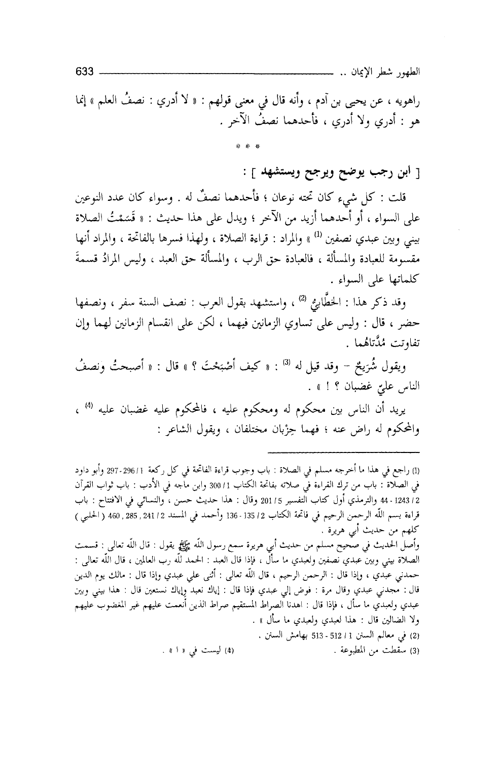 والمرادُ: قراءة الصلاة، ولهذا فسّرها بالفاتحة، والمرادُ أنَّها مقسومة لِلعبادة والمسألة، فالعبادةُ حقُّ الربِّ والمسألةُ حقُّ العبد، وليس المرادُ قسمة كلماتها على السواء (¬3) . وقد ذكر هذا الخطابيُّ، واستشهد بقول العرب: نصف السنة سفر، ونصفها حَضَر، قال: وليس على تساوي الزمانين فيهما، لكن على انقسام الزمانين لهما، وإنْ تفاوتت مدتاهما (¬4) ، وبقول شريح - وقيل له: كيف أصبحت؟ - قال: أصبحت ونصفُ الناس عليَّ غضبان (¬5) ، يريد أنَّ الناسَ بين محكومٍ له ومحكومٍ عليه، فالمحكومُ عليه غضبان، والمحكوم له راضٍ عنه، فهما حزبان مختلفان. ويقول الشاعر: