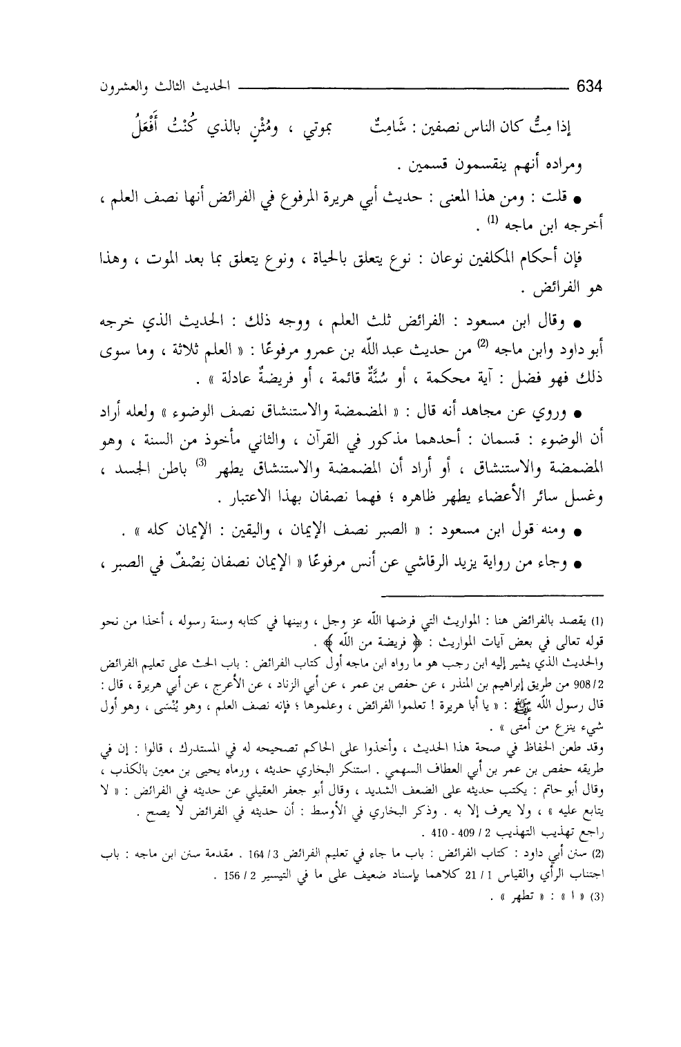 قلت: ومِنْ هذا المعنى: حديث أبي هريرة المرفوع في الفرائض: ((إنَّها نصف العلم)) خرَّجه ابن ماجه (¬1) ، فإنَّ أحكامَ المكلفين نوعان: نوع يتعلق بالحياة، ونوع يتعلَّقُ بما بعدَ الموتِ، وهذا هو الفرائضُ. وقال ابنُ مسعود: الفرائضُ ثلث العلم (¬2) . ووجه ذلك الحديث الذي خرَّجه أبو داود (¬3) وابنُ ماجه (¬4)