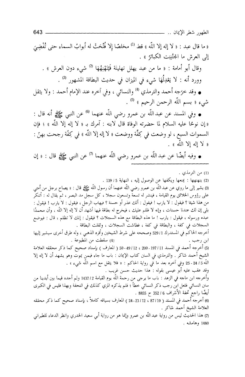 وقال أبو أمامة: ما من عبدٍ يُهلِّل تهليلةً، فيُنهْنِهُها (¬1) شيءٌ دونَ العرشِ، وورد أنَّه لا يعدِلُها شيء في الميزان في حديث البطاقة المشهور، وقد خرَّجه أحمد (¬2) والترمذي (¬3) والنَّسائي، وفي آخره عندَ الإمامِ أحمد: ((ولا يثقل شيءٌ بسم الله الرحمن الرحيم)) . وفي " المسند " (¬4) عن عبد الله بن عمرو، عن النَّبيِّ - صلى الله عليه وسلم - أنَّه قال: ((إنَّ نوحاً - عليه السلام - لمَّا حضرته الوفاةُ، قال لابنه: آمرك بـ (لا إله إلا الله) ، فإنَّ السماوات السبعَ والأرضين السبع لو وضعت في كفةٍ، ووضعت لا إله إلا الله في كفَّةٍ، رجحت بهنَّ لا إله إلا الله)) .