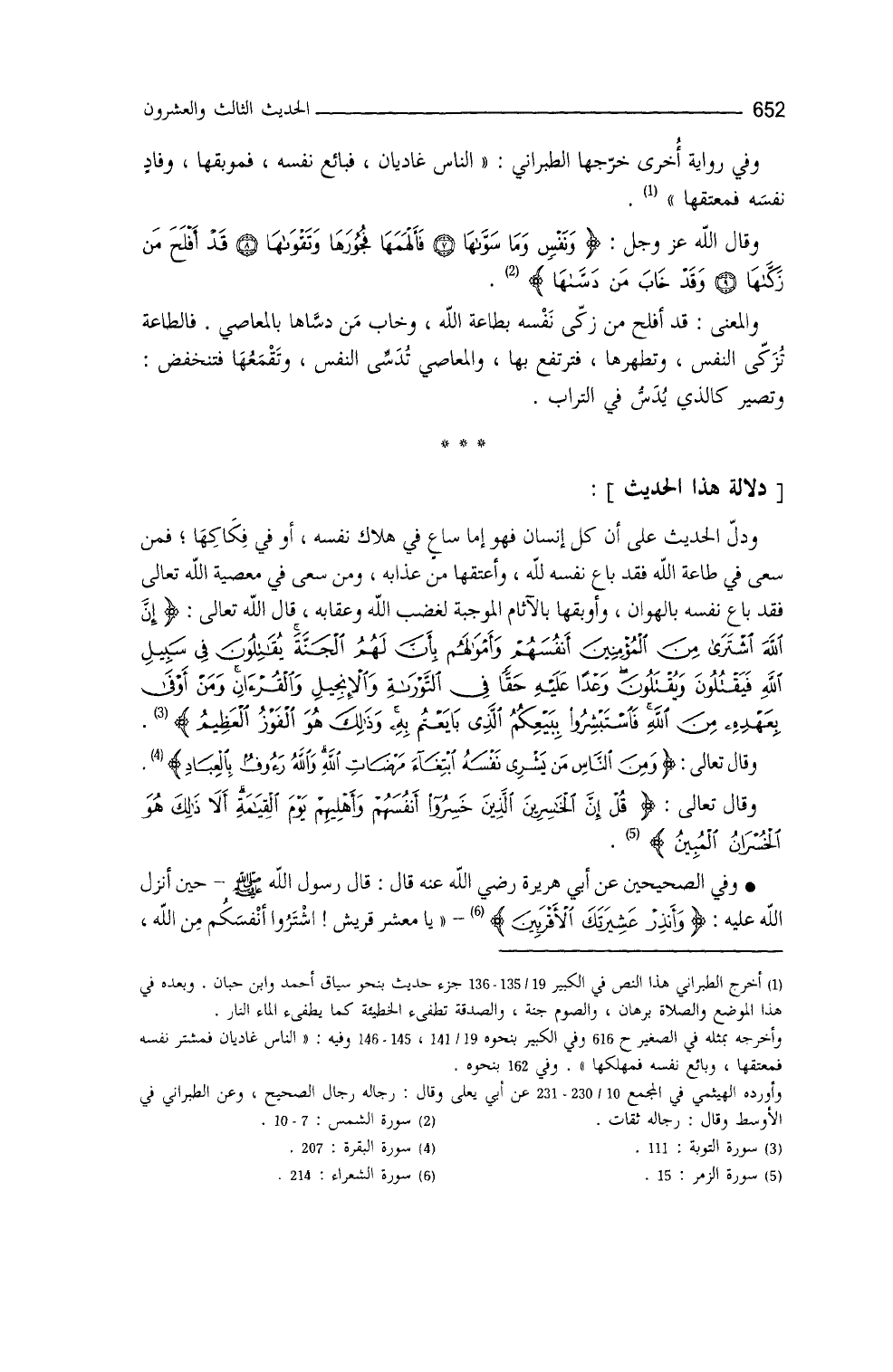 ودلَّ الحديثُ على أن كلَّ إنسان فهو ساعٍ في هلاك نفسه، أو في فِكاكِها، فمن سعى في طاعة الله، فقد باع نفسَه للهِ، وأعتقها من عذابه، ومن سعى في معصيةِ الله، فقد باعَ نفسَه بالهوان، وأوبقها بالآثام الموجبة لغضب الله وعقابه، قال الله - عز وجل -: {إِنَّ اللهَ اشْتَرَى مِنَ الْمُؤْمِنِينَ أَنْفُسَهُمْ وَأَمْوَالَهُمْ بِأَنَّ لَهُمُ الْجَنَّةَ} إلى قوله: {فَاسْتَبْشِرُوا بِبَيْعِكُمُ الَّذِي بَايَعْتُمْ بِهِ وَذَلِكَ هُوَ الْفَوْزُ الْعَظِيمُ} (¬2) ، وقال تعالى: {وَمِنَ النَّاسِ مَنْ يَشْرِي نَفْسَهُ ابْتِغَاءَ مَرْضَاتِ اللهِ وَاللهُ رَؤُوفٌ بِالْعِبَادِ} (¬3) ، وقال تعالى: {قُلْ إِنَّ الْخَاسِرِينَ الَّذِينَ خَسِرُوا أَنْفُسَهُمْ وَأَهْلِيهِمْ يَوْمَ الْقِيَامَةِ أَلا ذَلِكَ هُوَ الْخُسْرَانُ الْمُبِينُ} (¬4) .