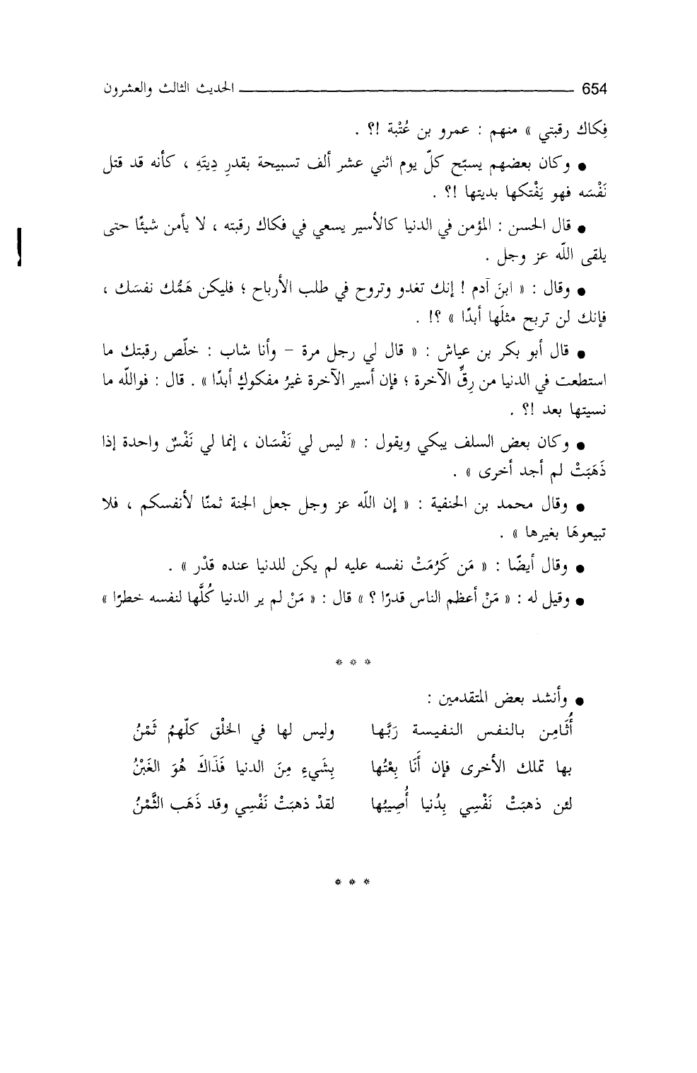 وقال محمد بن الحنفية: إنَّ الله - عز وجل - جعل الجنَّة ثمناً لأنفسكم، فلا تبيعُوها بغيرها (¬6) . وقال: من كرمت نفسه عليه لم يكن للدنيا عنده قدر (¬7) . وقيل له: من