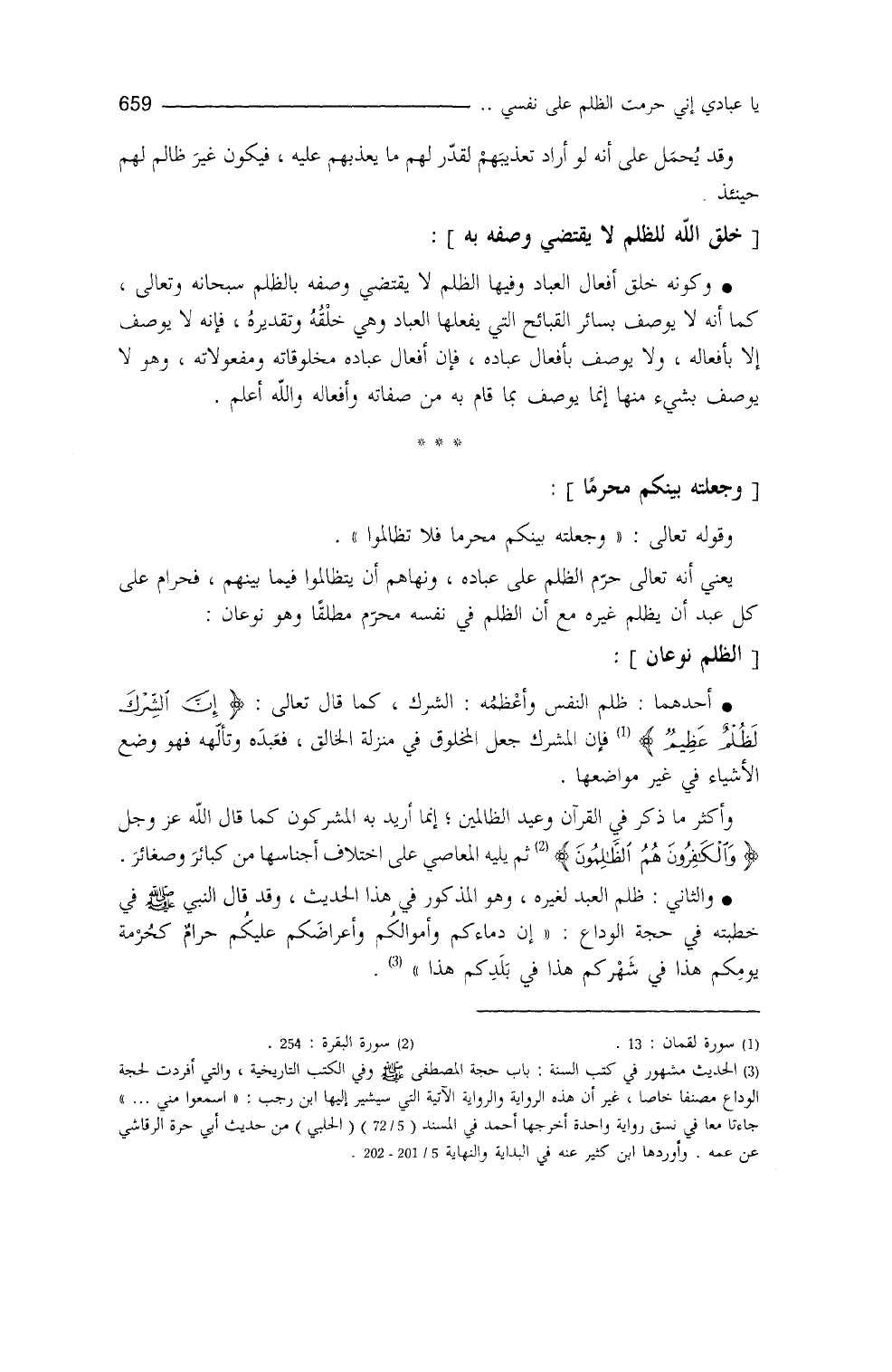 وقوله: ((وجعلتُه بينكم محرَّماً، فلا تظالموا)) يعني: أنَّه تعالى حَرَّم الظلم على عباده، ونهاهم أنْ يتظالموا فيما بينهم، فحرامٌ على كلِّ عبدٍ أنْ يظلِمَ غيره، مع أنَّ الظُّلم في نفسه محرَّم مطلقاً، وهو نوعان: