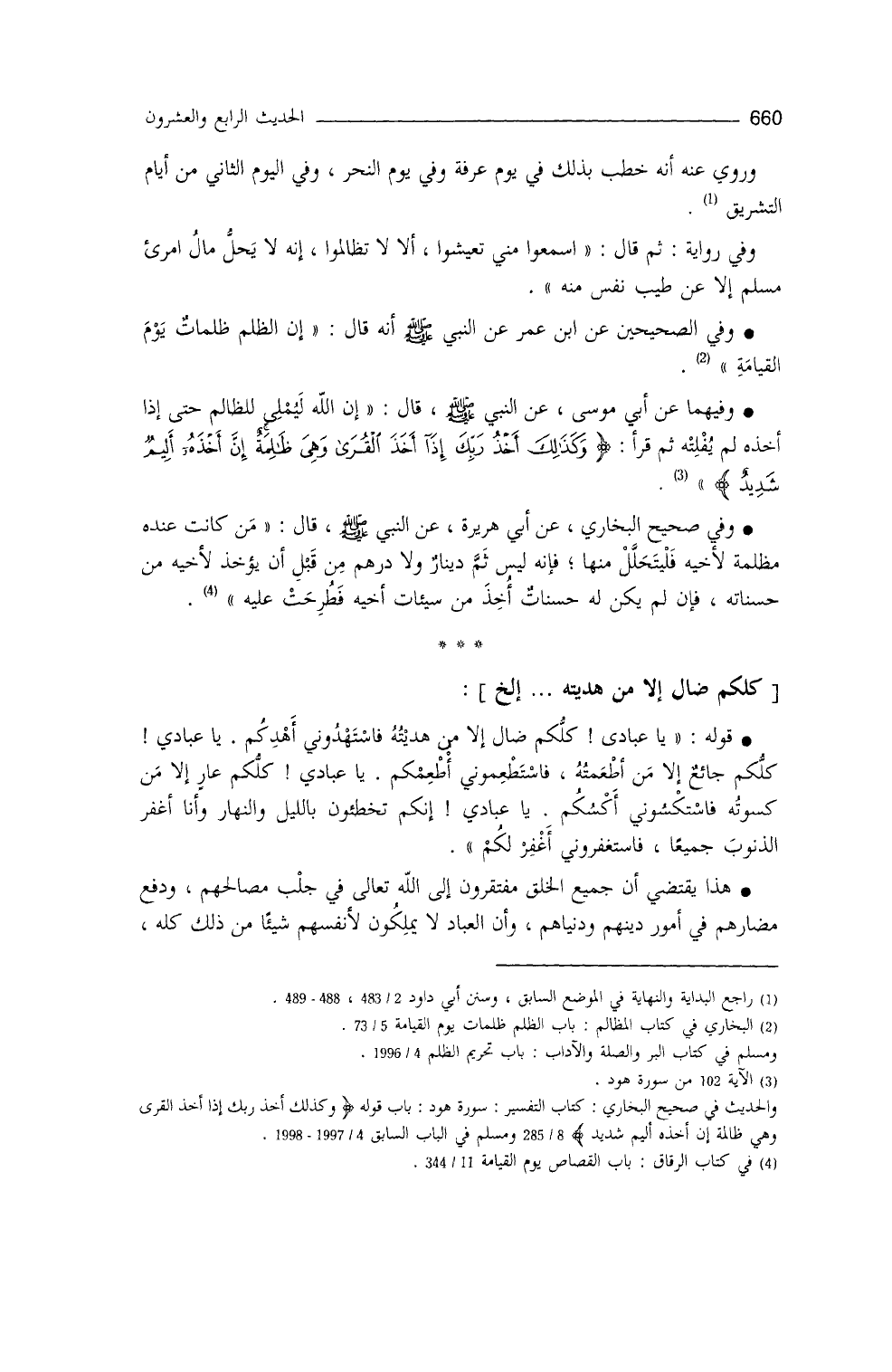 قوله: ((يا عبادي، كلُّكُم ضالٌّ إلاَّ من هديتُه، فاستهدوني أهدِكم، يا عبادِي، كُلُّكم جائعٌ إلاَّ من أطعمتُه، فاستطعموني أطعمكم، يا عبادي، كلُّكم عارٍ إلاَّ من كَسوتُهُ، فاستكسوني أكسكُم، يا عبادي إنَّكم تُخطئون باللَّيل ... والنَّهار، وأنا أغفرُ الذُّنوب جَميعاً، فاستغفروني أغفر لكم)) .