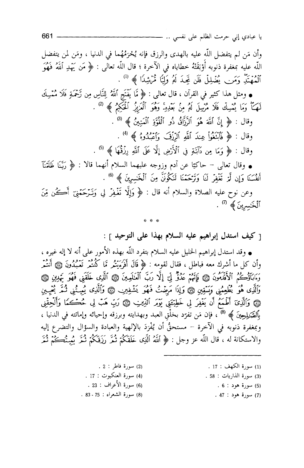 وقد استدلَّ إبراهيمُ الخليلُ - عليه السلام - بتفرُّد الله بهذه الأمور على أنَّه لا إله غيره، وإنَّ كلَّ ما أشرك معه، فباطل، فقال لقومه: {أَفَرَأَيْتُمْ مَا كُنْتُمْ تَعْبُدُونَ أَنْتُمْ وَآبَاؤُكُمُ الأَقْدَمُونَ فَإِنَّهُمْ عَدُوٌّ لِي إلاَّ رَبَّ الْعَالَمِينَ الَّذِي خَلَقَنِي فَهُوَ يَهْدِينِ وَالَّذِي هُوَ يُطْعِمُنِي وَيَسْقِينِ وَإِذَا مَرِضْتُ فَهُوَ يَشْفِينِ وَالَّذِي يُمِيتُنِي ثُمَّ يُحْيِينِ وَالَّذِي أَطْمَعُ أَنْ يَغْفِرَ لِي خَطِيئَتِي يَوْمَ الدِّينِ} (¬8) ، فإنَّ من تفرَّد بخلق العبد وبهدايته وبرزقه وإحيائه وإماتته في الدنيا، وبمغفرة ذنوبه في الآخرة، مستحقٌّ أنْ يُفرَدَ بالإلهية والعبادة والسؤال والتضرُّع إليه، والاستكانة له. قال الله - عز وجل -: {اللهُ الَّذِي خَلَقَكُمْ ثُمَّ رَزَقَكُمْ ثُمَّ يُمِيتُكُمْ ثُمَّ