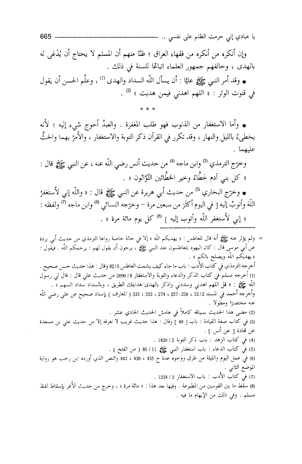 وإنْ أنكره من أنكره من فقهاء العراق ظناً منهم أنَّ المسلم لا يحتاج أنْ يُدعى له بالهُدى، وخالفهم جمهورُ العلماء اتِّباعاً للسنة في ذلك. وقد أمر النَّبيُّ - صلى الله عليه وسلم - علياً أنْ يسأل الله السداد والهدى (¬1) ، وعلَّم الحسن أنْ يقولَ في قُنوتِ الوتر: ((اللهم اهدني فيمن هديت)) (¬2) .
