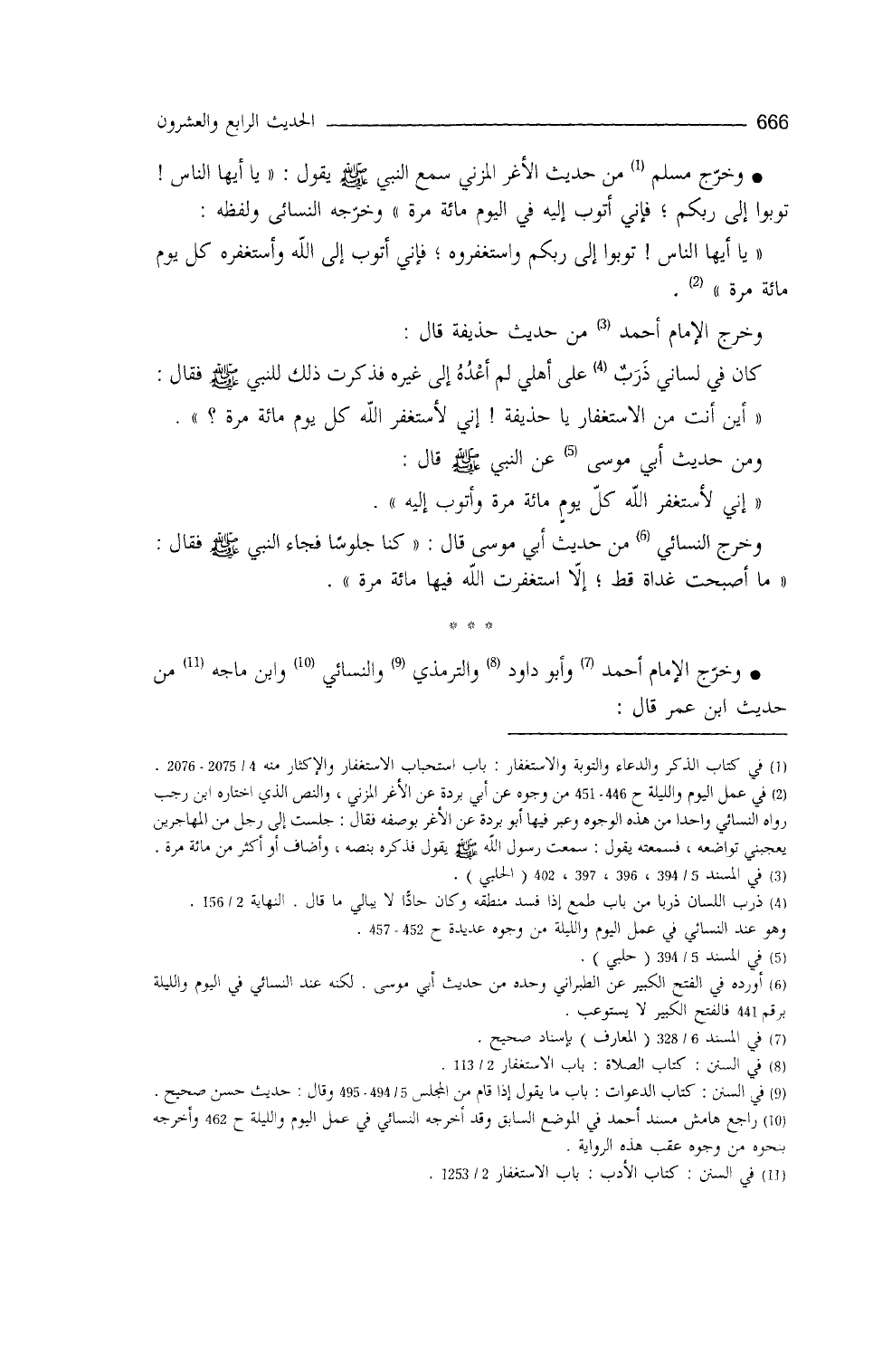 مِنَ الاستغفار يا حُذيفَةُ، إنِّي لأستغفرُ اللهَ كل يوم مئة مرَّة)) . ومن حديث أبي موسى، عن النَّبيِّ - صلى الله عليه وسلم -، قال: ((إنِّي لأستغفر الله كل يومٍ مئة مرّة وأتوب