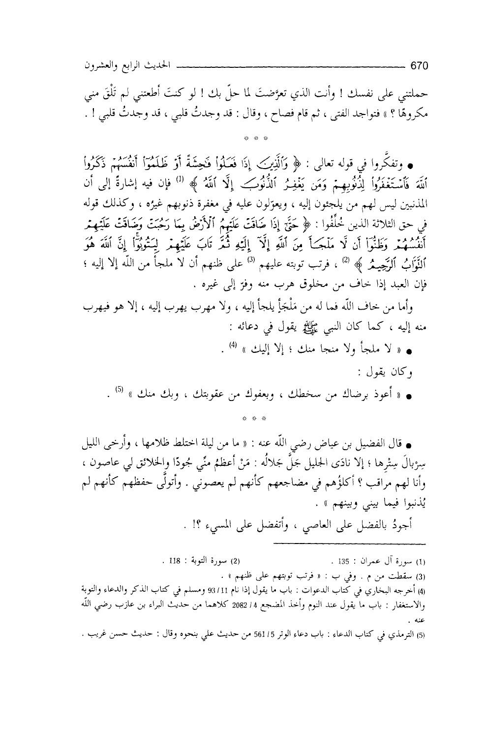 وتفكروا في قوله: {وَالَّذِينَ إِذَا فَعَلُوا فَاحِشَةً أَوْ ظَلَمُوا أَنْفُسَهُمْ ذَكَرُوا اللهَ فَاسْتَغْفَرُوا لِذُنُوبِهِمْ وَمَنْ يَغْفِرُ الذُّنُوبَ إِلاَّ اللهُ} (¬1) ، فإنَّ فيه إشارةً إلى أنَّ المذنبين ليس لهم من يلجؤون إليه، ويُعوِّلون عليه في مغفرة ذنوبهم غيره، وكذلك قوله في حقِّ الثلاثة الذين خُلِّفوا: {حَتَّى إِذَا ضَاقَتْ عَلَيْهِمُ الأَرْضُ بِمَا رَحُبَتْ وَضَاقَتْ عَلَيْهِمْ أَنْفُسُهُمْ وَظَنُّوا أَنْ لا مَلْجَأَ مِنَ اللهِ إِلاَّ إِلَيْهِ ثُمَّ تَابَ عَلَيْهِمْ لِيَتُوبُوا إِنَّ اللهَ هُوَ التَّوَّابُ الرَّحِيمُ} (¬2) ، فرتَّب توبته عليهم على ظنِّهم أنْ لا ملجأ من الله إلا إليه، فإنَّ العبدَ إذا خاف من مخلوقٍ، هرب منه، وفرَّ إلى غيره، وأمَّا من خاف من الله، فما له منْ ملجأ يلجأُ إليه، ولا مهرب يهربُ إليه إلاَّ هو، فيهرُب منه إليه، كما كان النَّبيُّ - صلى الله عليه وسلم - يقول في دعائه: ((لا ملجأ، ولا مَنجَا منك إلاَّ إليك)) (¬3) وكان يقول: ((أعوذُ برضاكَ مِنْ سَخَطِك، وبعفوك من عقوبتك، وبِكَ منكَ)) (¬4) .