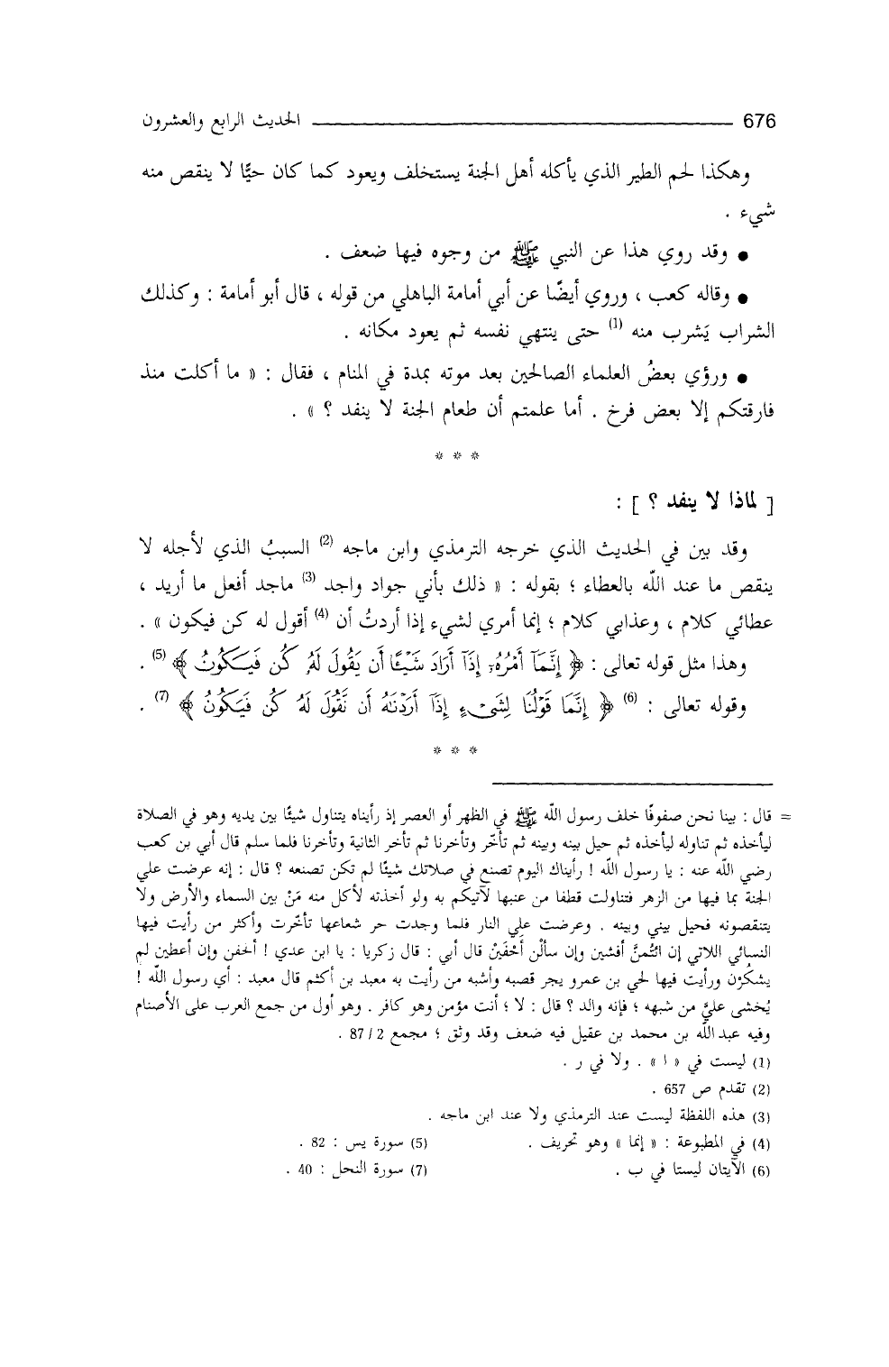 وهكذا لحمُ الطَّيرِ الذي يأكلُه أهل الجنَّة يستخلف ويعودُ كما كان حياً لا ينقص منه شيءٌ، وقد روي هذا عن النَّبيِّ - صلى الله عليه وسلم - من وجوهٍ فيها ضعفٌ (¬1) ، وقاله كعبٌ. وروي أيضاً عن أبي أمامة الباهلي من قوله، قال أبو أمامة: وكذلك الشرابُ يشرب حتى ينتهي نفَسُه، ثم يعودُ مكانَه. ورؤي بعض العلماء الصالحين بعدَ موته بمدَّة في المنام فقال: ما أكلتُ منذ فارقتكم إلاَّ بعضَ فرخٍ، أما علمتم أنَّ طعامَ الجنَّة لا ينفَدُ؟ (¬2)