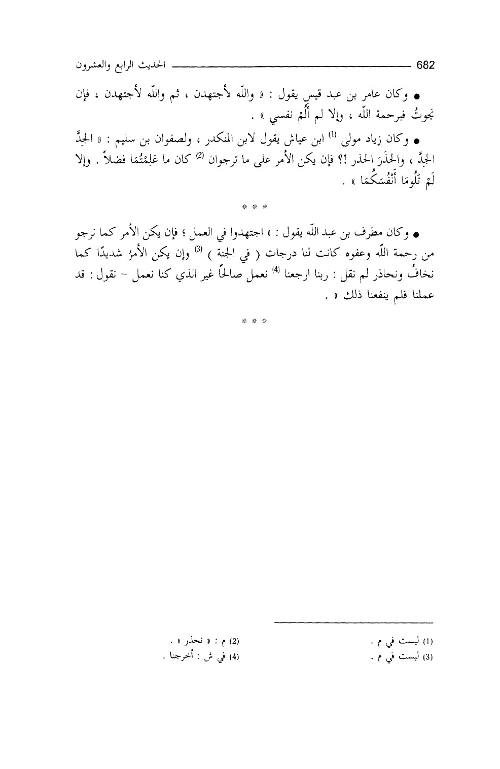وكان عامر بن عبد قيس يقول: والله لأجتهدنَّ، ثم والله لأجتهدنَّ، فإنْ نجوت فبرحمة الله، وإلاَّ لم ألم نفسي (¬1) .