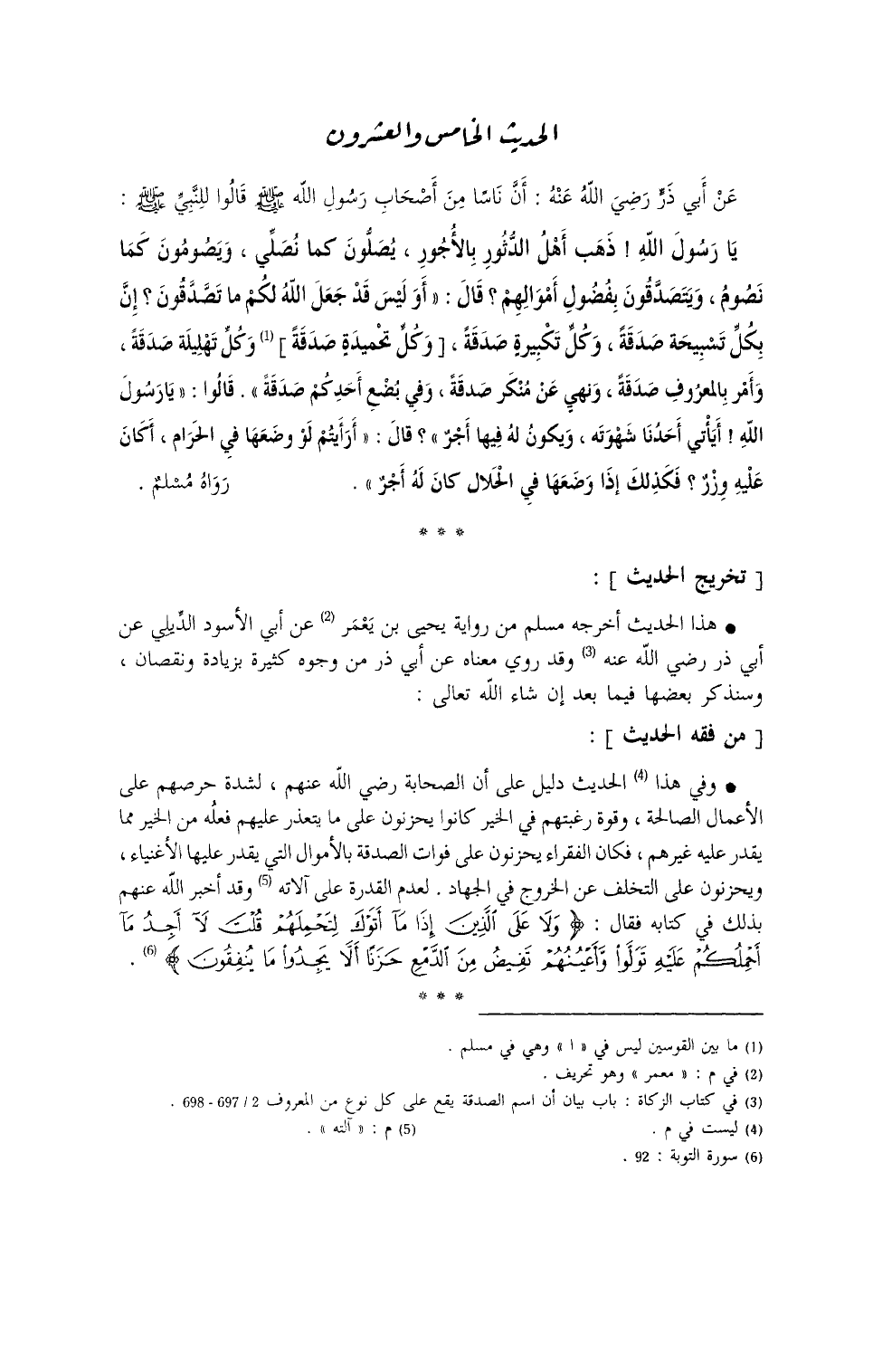 يا رَسُولَ اللهِ ذَهَبَ أهْلُ الدُّثُورِ بالأجورِ، يُصلُّونَ كَما نُصَلِّي، ويَصومُونَ كَمَا نَصُومُ، ويتَصدَّقُونَ بفُضُولِ أموالِهمْ، قال: ((أوليسَ قد جعلَ اللهُ لَكُمْ ما تَصَّدَّقُونَ؟ إنَّ بكُلِّ تَسبيحةٍ صَدقةً، وكُلِّ تَكبيرةٍ صَدقَةً، وكُلِّ تَحْمِيدةٍ صَدقةً، وكُلِّ تَهْليلَةٍ صدقةً، وأمْرٌ بِالمَعْروفِ صَدقَةٌ، ونَهْيٌ عَنْ مُنكَرٍ صَدقَةٌ، وفي بُضْعِ أحَدِكُم صَدقَةٌ)) . قالوا: يا رسولَ الله، أيأتِي أحدُنا شَهْوَتَهُ ويكونُ لهُ فيها ... أجْرٌ؟ قال: ((أرأيتُمْ لَوْ وَضَعَها في حَرَامٍ، أكانَ عليهِ وِزْرٌ. فكذلك إذا وضَعَها في الحلالِ كانَ لهُ أَجْرٌ)) . رَواهُ مُسلمٌ (¬1) .