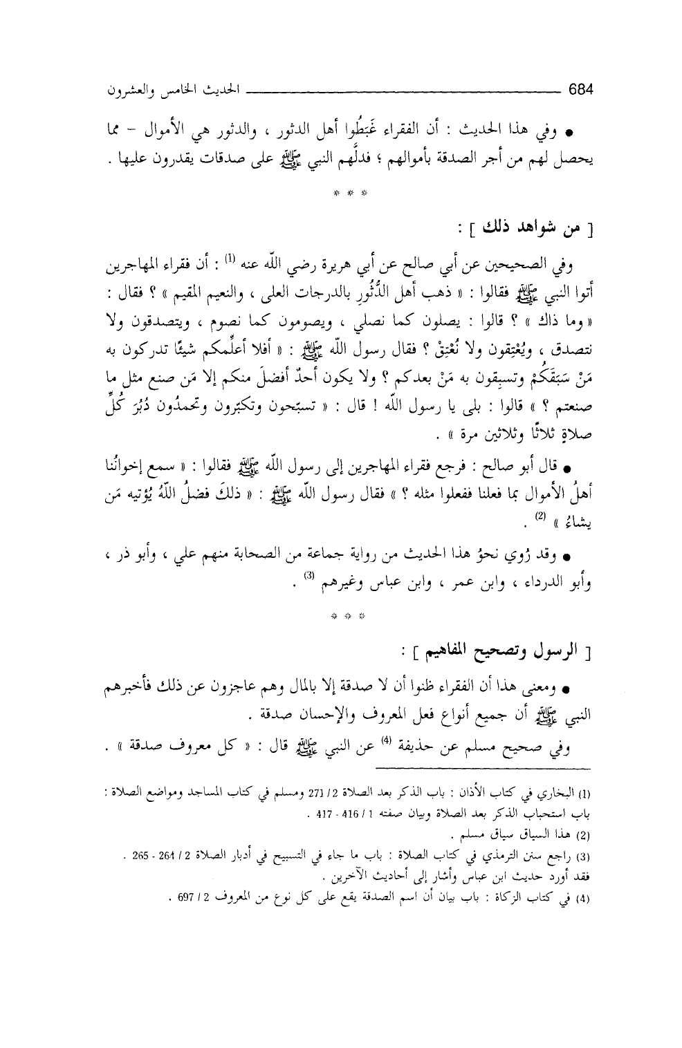 صالح: فرجع فقراءُ المهاجرين إلى رسول الله - صلى الله عليه وسلم - فقالوا: سمع إخواننا أهلُ الأموالِ بما فعلنا ففعلوا مثله، فقال رسولُ الله - صلى الله عليه وسلم -: {ذَلِكَ فَضْلُ اللهِ يُؤْتِيهِ مَنْ