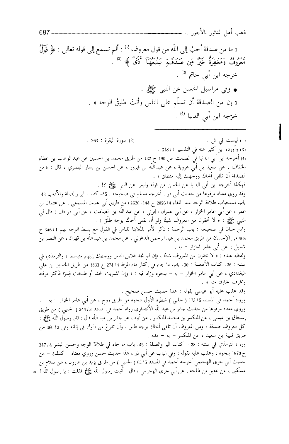 وفي مراسيل الحسن (¬3) ، عن النَّبيِّ - صلى الله عليه وسلم -: ((إنَّ مِنَ الصَّدقة أنْ تسلِّم على النَّاس وأنت طليق الوجه)) . خرَّجه ابن أبي الدُّنيا.