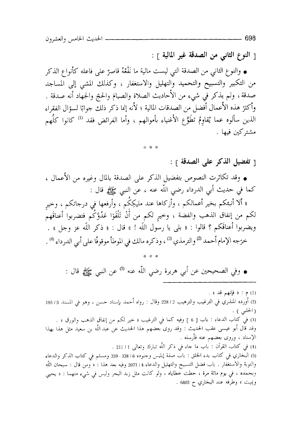 والنَّوع الثاني من الصدقة التي ليست مالية: ما نفعُه قاصرٌ على فاعله، كأنواع الذِّكر: مِنَ التَّكبير، والتَّسبيح، والتَّحميد، والتَّهليل، والاستغفار، وكذلك المشيُ إلى المساجدِ صدقة، ولم يذكر في شيء من الأحاديث الصَّلاة والصيام والحج والجهاد أنَّه صدقة، وأكثرُ هذه الأعمال أفضلُ من الصَّدقات الماليَّة؛ لأنَّه إنَّما ذكر ذلك جواباً لسؤالِ الفُقراء الَّذين سألوه عمَّا يُقاوم تطوَّع الأغنياء بأموالهم، وأما الفرائض، فقد كانوا كلهم مشتركين فيها.