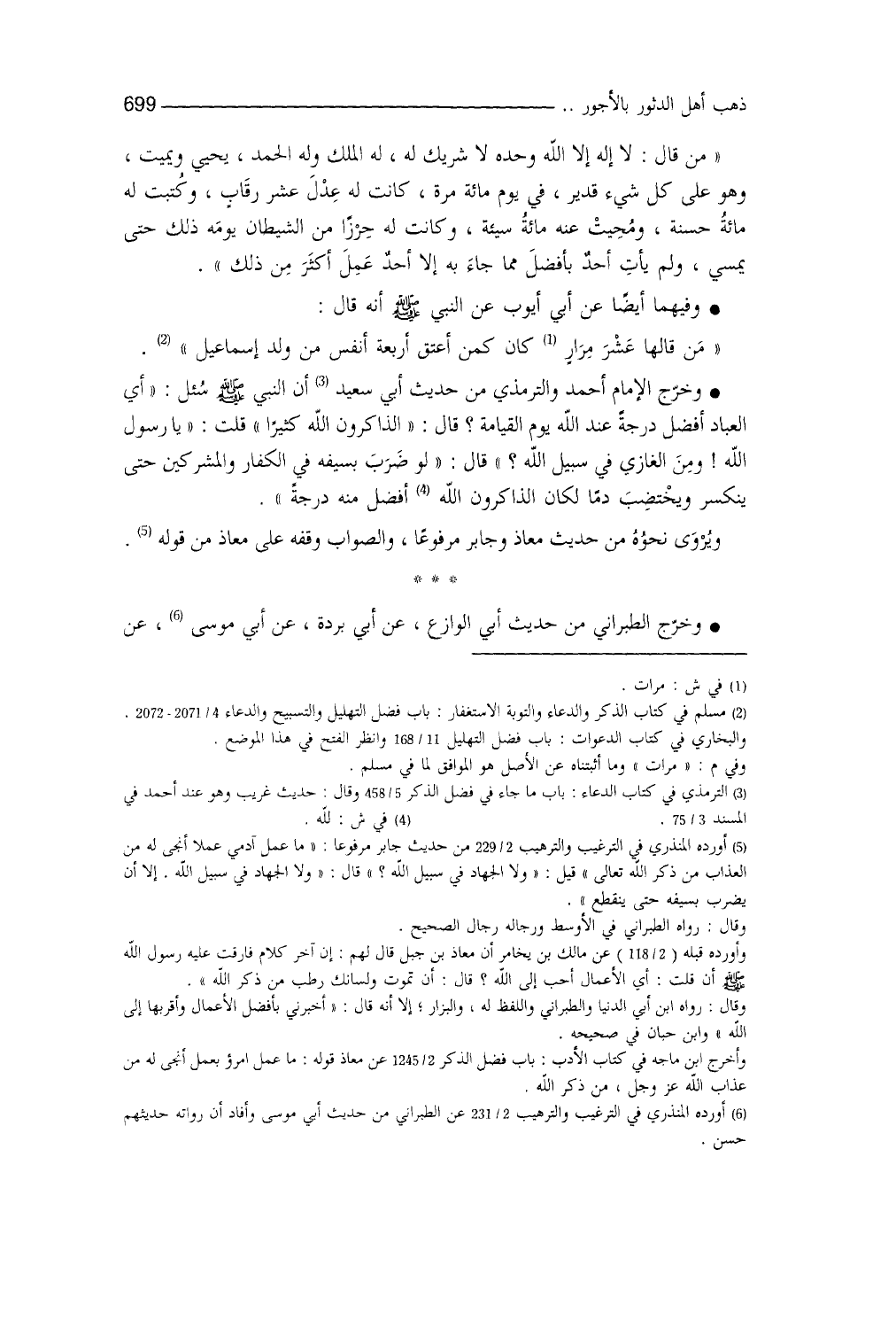 ((مَنْ قال: لا إله إلا الله وحدَه لا شريكَ له، له الملكُ، وله الحمدُ، يُحيي ويُميت، وهو على كلِّ شيءٍ قديرٌ في يوم مئة مرَّة، كانت له عَدْلَ عشر رقاب، وكُتبت له مئة حسنةٍ، ومُحيت عنه مئة سيئةٍ، وكانت له حِرْزاً من الشَّيطان يومَه ذلك حتَّى يُمسي، ولم يأتِ أحدٌ بأفضلَ ممَّا جاءَ به إلاَّ أحدٌ عَمِلَ أكثرَ من ذلك)) .