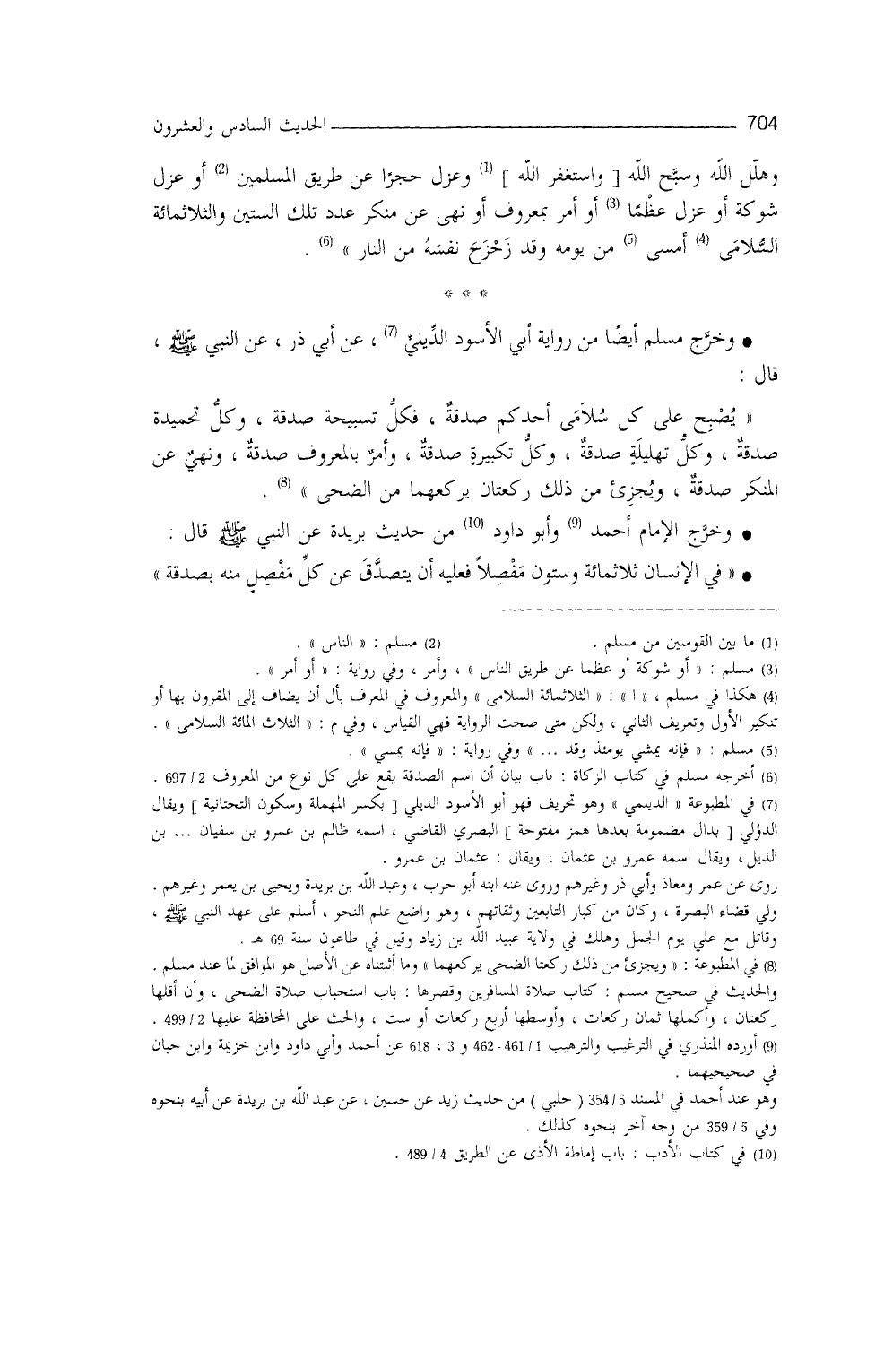 وخرَّج مسلم (¬1) أيضاً من رواية أبي الأسود الدَّيلي، عن أبي ذرٍّ، عَنِ النَّبيِّ - صلى الله عليه وسلم -، قال: ((يُصبح على كلِّ سُلامى مِن أحدكم صدقةٌ، فكلُّ تسبيحةٍ صدقةٌ، وكلُّ تحميدةٍ صدقةٌ، وكلُّ تهليلةٍ صدقةٌ، وكلُّ تكبيرةٍ صدقةٌ، وأمرٌ بالمعروف صدقةٌ، ونهيٌ عَنِ المُنكرِ صدقةٌ، ويُجزئ من ذلك ركعتان يركعهما منَ الضُّحى)) .