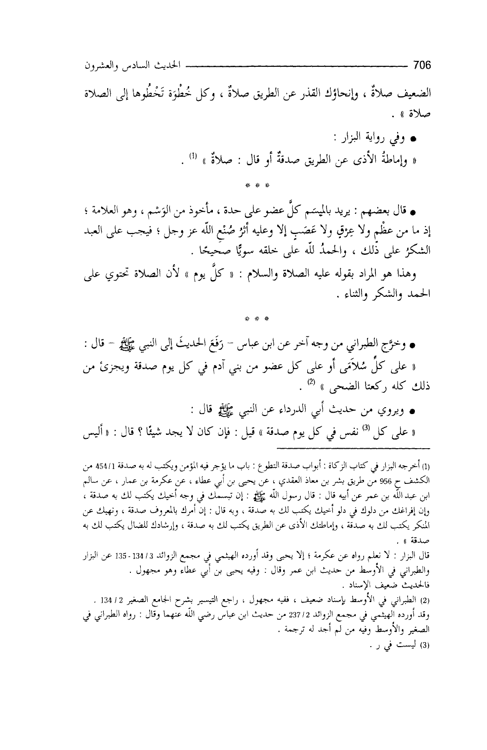 الضعيف صلاة، وإنحاؤكَ القذرَ عَنِ الطَّريقِ صلاةٌ، وكلُّ خطوةٍ تَخطوها إلى الصَّلاة صلاةٌ)) (¬1) . وفي رواية البزار: ((وإماطةُ الأذى عَنِ الطَّريق صدقةٌ)) أو قال: ((صلاةٌ)) .