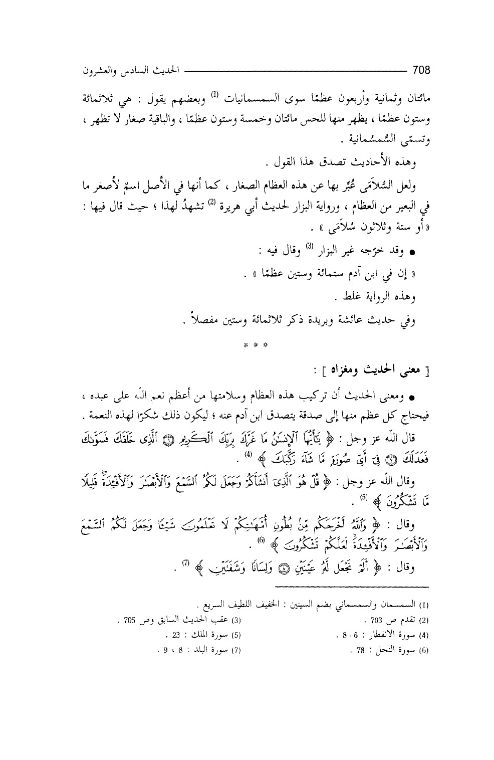 ومعنى الحديث: أنَّ تركيب هذه العظام وسلامتها مِن أعظم نِعَمِ الله على عبده، فيحتاج كلُّ عظم منها إلى صدقة يتصدق ابنُ آدم عنه، ليكونَ ذلك شكراً لهذه النعمة. قال الله - عز وجل -: {يَا أَيُّهَا الإنْسَانُ مَا غَرَّكَ بِرَبِّكَ الْكَرِيمِ الَّذِي خَلَقَكَ فَسَوَّاكَ فَعَدَلَكَ فِي أَيِّ صُورَةٍ مَا شَاءَ رَكَّبَكَ} (¬1) ، وقال - عز وجل -: {قُلْ هُوَ الَّذِي أَنْشَأَكُمْ وَجَعَلَ لَكُمُ السَّمْعَ وَالأَبْصَارَ وَالأَفْئِدَةَ قَلِيلاً مَا تَشْكُرُونَ} (¬2) ، وقال