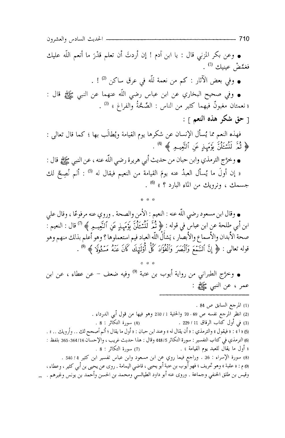 وقال عليُّ بن أبي طلحة، عن ابن عباس في قوله: {ثُمَّ لَتُسْأَلُنَّ يَوْمَئِذٍ عَنِ ... النَّعِيمِ} (¬9) ، قال: النعيم: صحَّةُ الأبدان والأسماع والأبصار، يسأَلُ الله العبادَ: فيما استعملوها؟ وهو أعلمُ بذلك منهم (¬10) ، وهو قوله تعالى: {إِنَّ السَّمْعَ وَالْبَصَرَ وَالْفُؤَادَ كُلُّ أُولَئِكَ كَانَ عَنْهُ مَسْؤُولاً} (¬11) .