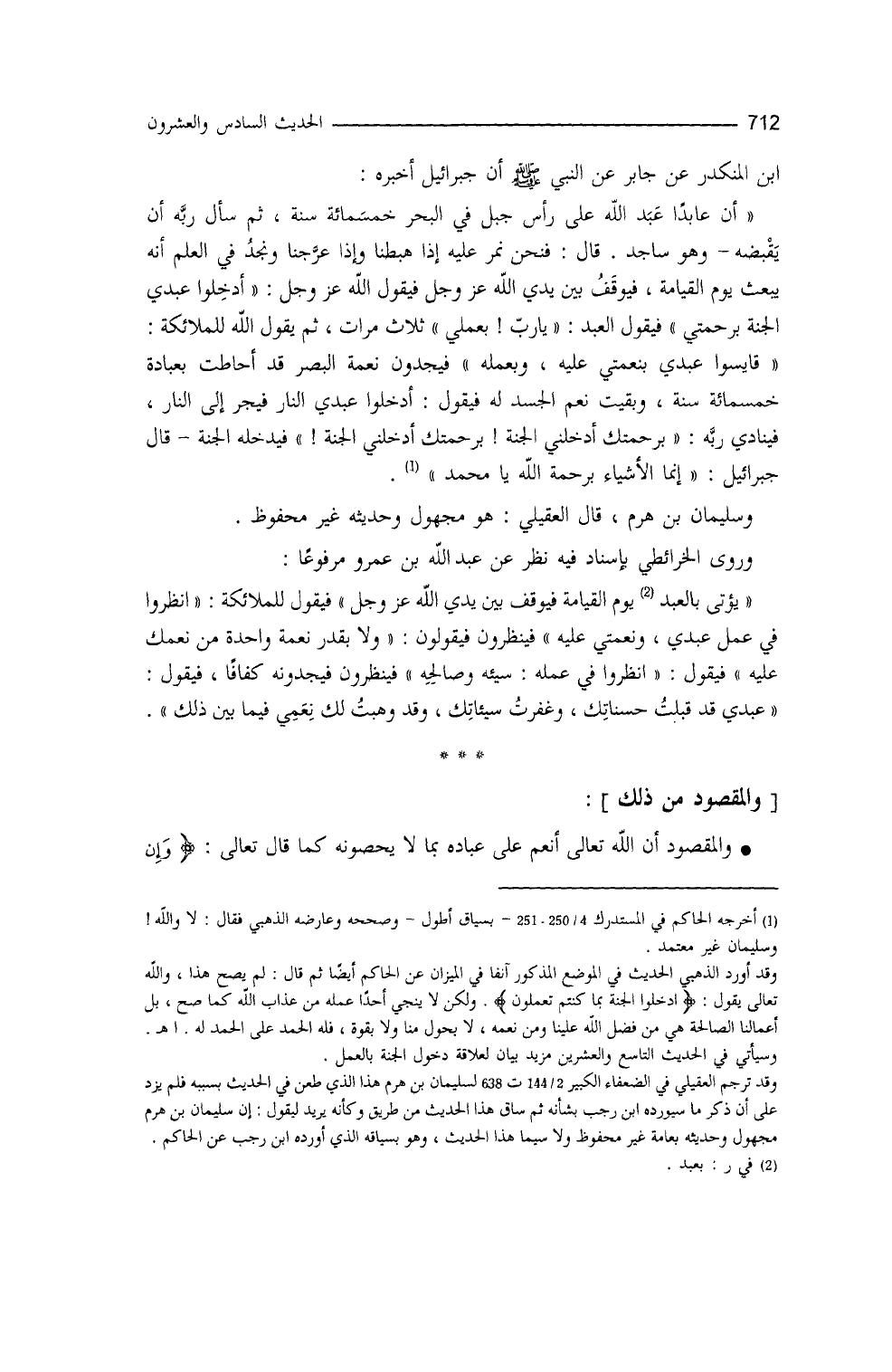 بن المنكدر، عن جابر، عن النَّبيِّ - صلى الله عليه وسلم -: أنَّ جبريل أخبره أنَّ عابداً عبد الله على رأس جبلٍ في البحر خمس مئة سنة، ثم سأل ربَّه أنْ يَقبِضَهُ وهو ساجدٌ، قال: فنحن نمُرُّ عليه إذا هبطنا وإذا عرَجنا، ونجد في العلم أنَّه يُبعث يَوْمَ القيامةِ، فيوقف بَيْنَ يدي الله - عز وجل -، فيقول الربُّ - عز وجل -: أدخلوا عبدي الجنة برحمتي، فيقولُ العبدُ: يا ربِّ، بعملي، ثلاثَ مرَّات، ثم يقول الله للملائكة: قايسوا عبدي بنعمتي عليه وبعمله، فيجدون نعمة البصر قد أحاطت بعبادةِ خمس مئة سنة، وبقيت نِعَمُ الجسد له، فيقول: أدخلوا عَبْديَ النار، فيجرُّ إلى النار، فينادي ربه: برحمتك أدخلني الجنَّة، برحمتك، فيدخله الجنَّة، قال جبريل: إنَّما الأشياءُ برحمة الله يا محمد. وسُليمان بن هرم، قال العقيلي: هو مجهول وحديثُه غيرُ محفوظ (¬1) .