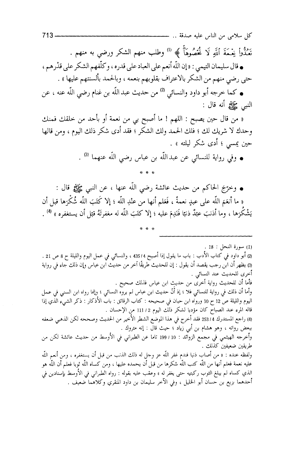 تَعُدُّوا نِعْمَتَ اللهِ لا تُحْصُوهَا} (¬1) ، وطلب منهمُ الشُّكرَ، ورضي به منهم. قال سليمان التيمي: إنَّ الله أنعم على العباد على قدره، وكلَّفهم الشكر على قدرهم حتى رَضِيَ منهم مِنَ الشُّكرِ بالاعتراف بقلوبهم بنعمه (¬2) ، وبالحمد بألسنتهم ... عليها، كما خرَّجه أبو داود (¬3) والنَّسائي (¬4) من حديث عبد الله بن غَنَّام، عن النَّبيِّ - صلى الله عليه وسلم - أنَّه قال: ((من قال حينَ يُصبِحُ: اللهمَّ ما أَصبَحَ بي من نعمةٍ أو بأحدٍ من خلقك، فمنك وحْدَكَ لا شريكَ لك، فلكَ الحمدُ ولك الشُّكْرُ، فقد أدَّى شُكْرَ ذلك اليومِ، ومن قالها حين يُمسي أدَّى شكر ليلته)) . وفي روايةٍ للنَّسائي عن