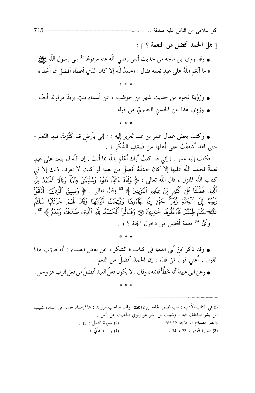 وقد ذكر ابنُ أبي الدنيا في " كتاب الشكر " (¬7) عن بعض العُلماء أنَّه صوَّب هذا القولَ: أعني قولَ من قال: إنَّ الحمدَ أفضلُ من النِّعم، وعن ابن عُيينة أنَّه خطَّأ قائلَه، قال: ولا يكون فعلُ العبدِ أفضلَ من فعلِ الربِّ - عز وجل - (¬8) .