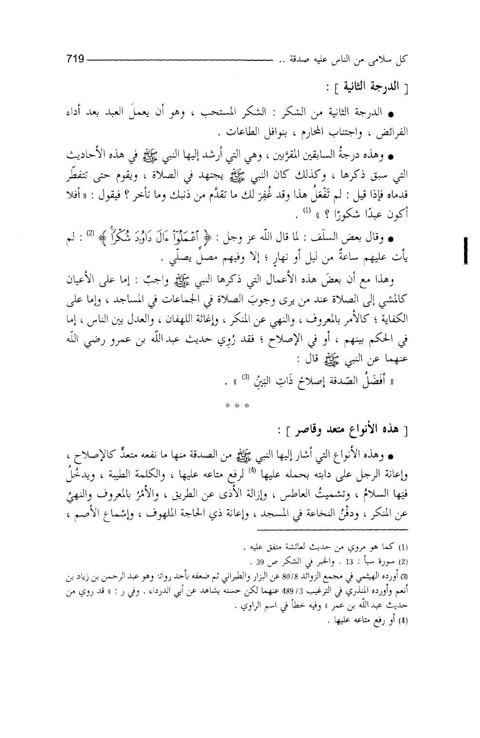 وهذا مع أنَّ بعضَ هذه الأعمال التي ذكرها النَّبيُّ - صلى الله عليه وسلم - واجبٌ: إمَّا على الأعيان، كالمشي إلى الصلاة عندَ من يرى وجوبَ الصَّلاة في الجماعات في المساجد، وإما على الكفاية، كالأمر بالمعروف، والنَّهي عن المنكر، وإغاثة الملهوف، والعدلِ بينَ الناسِ، إمَّا في الحكم بينهم، أو في الإصلاح. وقد روي من حديث عبد الله بن عمرو، عنِ النَّبيِّ - صلى الله عليه وسلم -، قال: ((أفضلُ الصَّدقةِ إصلاحُ ذات البين)) (¬4) .