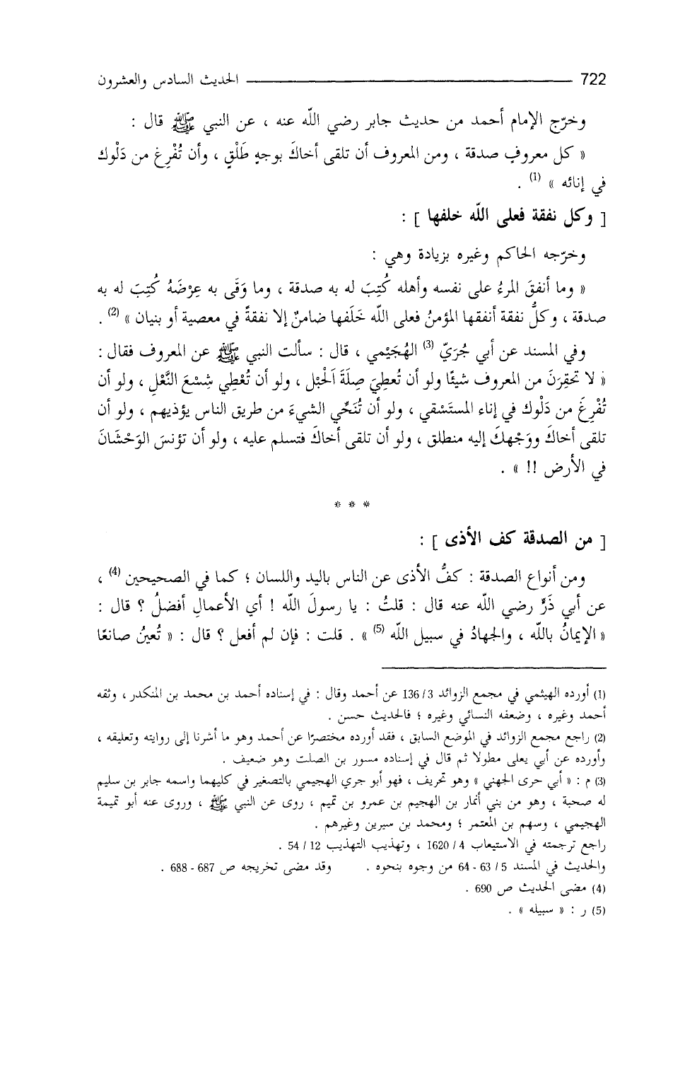 وخرَّج الإمامُ أحمد (¬1) من حديث جابر، عن النَّبيِّ - صلى الله عليه وسلم -، قال: ((كلُّ معروفٍ صدقةٌ، ومِنَ المعروف أنْ تلقَى أخاكَ بوجهٍ طلقٍ، وأنْ تُفرِغَ من دلوك في إنائه)) . وخرَّجه الحاكم (¬2)