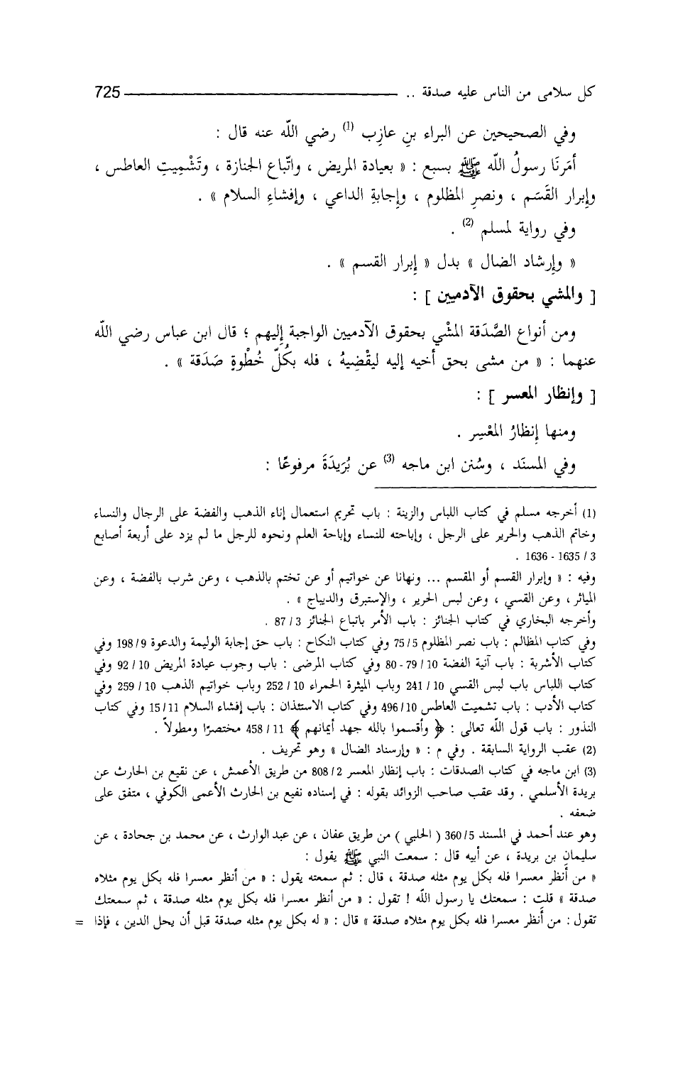 ومن أنواع الصَّدقة: المشي بحقوق الآدميين الواجبة إليهم، قال ابن عباس: من مشى بحقِّ أخيه إليه ليقضيه، فله بكلِّ خطوة صدقة (¬3) .
