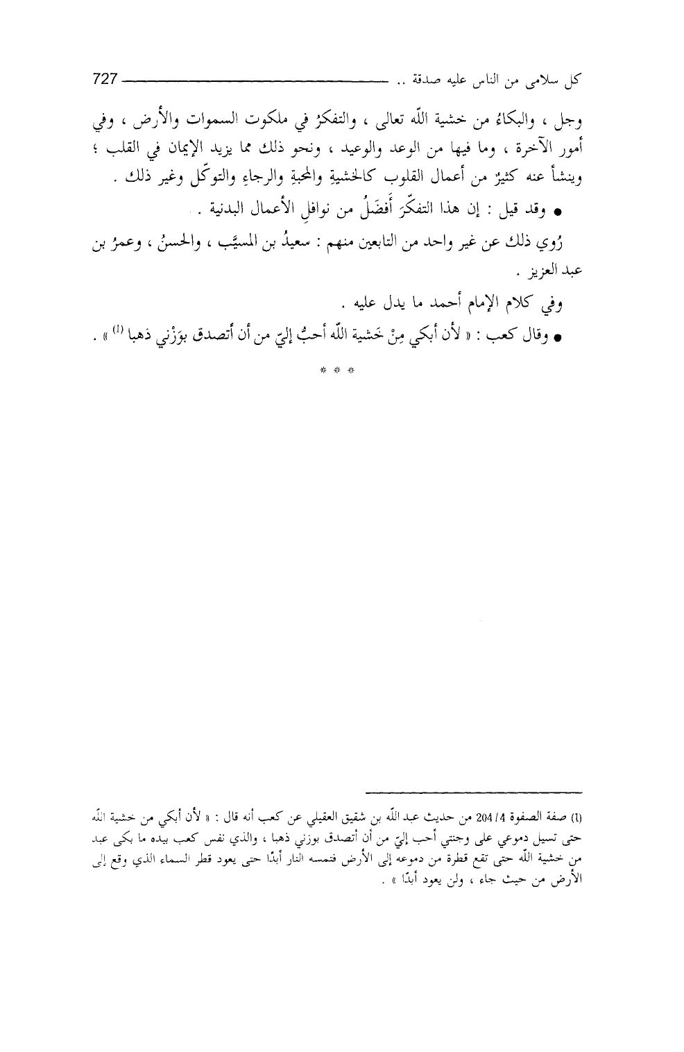 عبد العزيز، وفي كلام الإمام أحمد ما يدلُّ عليهِ. وقال كعب: لأنْ أبكي من خشية الله أحبُّ إليَّ من أنْ أتصدَّق بوزني ذهباً (¬3) .
