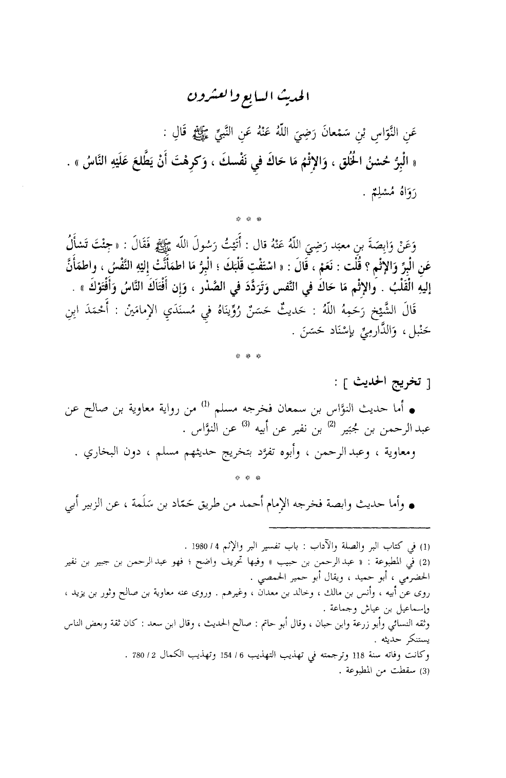 عَنِ النَّواسِ بنِ سَمعانِ - رضي الله عنه -، عَنِ النَّبيِّ - صلى الله عليه وسلم -، قال: ((البِرُّ حُسْنُ الخُلُقِ، والإثْمُ: ما حَاكَ في نَفْسِكَ، وكَرِهْتَ أنْ يَطَّلِعَ عليهِ النَّاسُ)) . رواهُ مسلمٌ (¬1) .