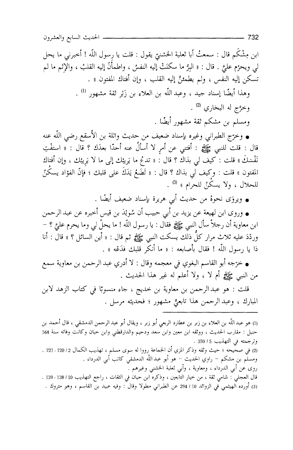 بن مِشْكَم قال: سمعتُ أبا ثعلبة الخشني يقول: قلتُ: يا رسول الله، أخبرني ما يحلُّ لي وما يحرُمُ عليَّ، فقال: ((البرُّ ما سَكَنَتْ إليه النَّفسُ، واطمأنَّ إليه القلبُ، والإثم ما لم تسكن إليه النَّفسُ، ولم يطمئنَّ إليه القلب، وإنْ أفتاك المفتون)) ، وهذا أيضاً إسنادٌ جيد، وعبد الله بن العلاء بن زبر ثقة مشهور (¬1) ، وخرَّجه البخاري (¬2) ، ومسلم بن مِشْكَم ثقةٌ مشهورٌ أيضاً (¬3) .