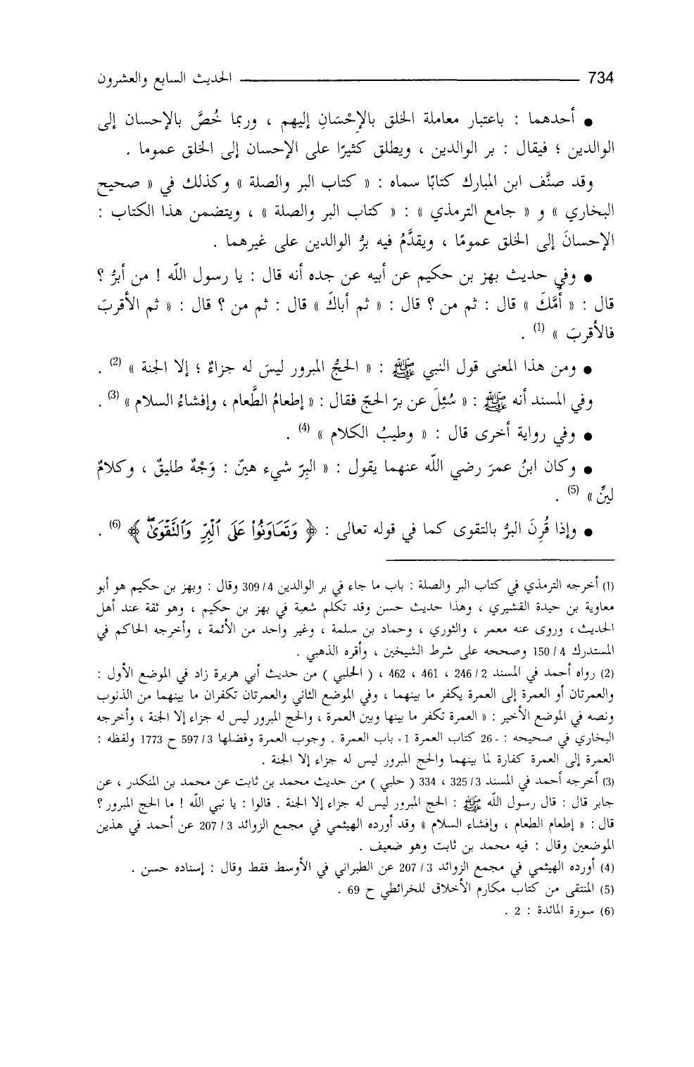 أحدُهما: باعتبار معاملة الخلق بالإحسان إليهم، وربما خصَّ بالإحسانِ إلى الوالدين، فيقال: برُّ الوالدين، ويطلق كثيراً على الإحسان إلى الخلق عموماً، وقد صنّف ابنُ المبارك كتاباً سماه كتاب " البر والصلة "، وكذلك في "صحيح البخاري" و" جامع الترمذي ": كتاب " البر والصلة "، ويتضمن هذا الكتاب الإحسان إلى الخلق عموماً، ويقدَّم فيه برُّ الوالدين على غيرهما. وفي حديث بهز بن حكيم، عن أبيه، عن جده: أنَّه قال: يا رسول الله مَنْ أبرُّ؟ قالَ: ((أمك)) ، قالَ: ثُمَّ من؟ قال: ((ثم أباك)) ، قال: ثم من؟ قالَ: ((ثُمَّ الأقرب فالأقرب)) (¬1) .