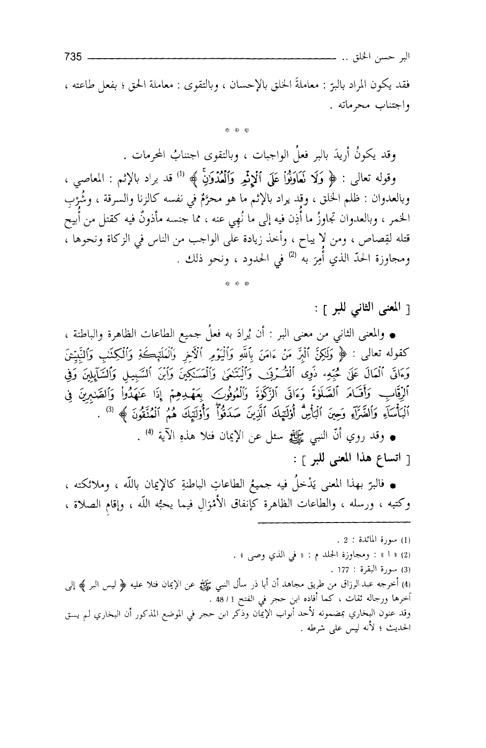 والمعنى الثاني من معنى البرِّ: أنْ يُراد به فعلُ جميع الطاعات الظاهرة والباطنة (¬4) ، كقوله تعالى: {وَلَكِنَّ الْبِرَّ مَنْ آمَنَ بِاللهِ وَالْيَوْمِ الآخِرِ وَالْمَلائِكَةِ وَالْكِتَابِ وَالنَّبِيِّينَ وَآتَى الْمَالَ عَلَى حُبِّهِ ذَوِي الْقُرْبَى وَالْيَتَامَى وَالْمَسَاكِينَ وَابْنَ