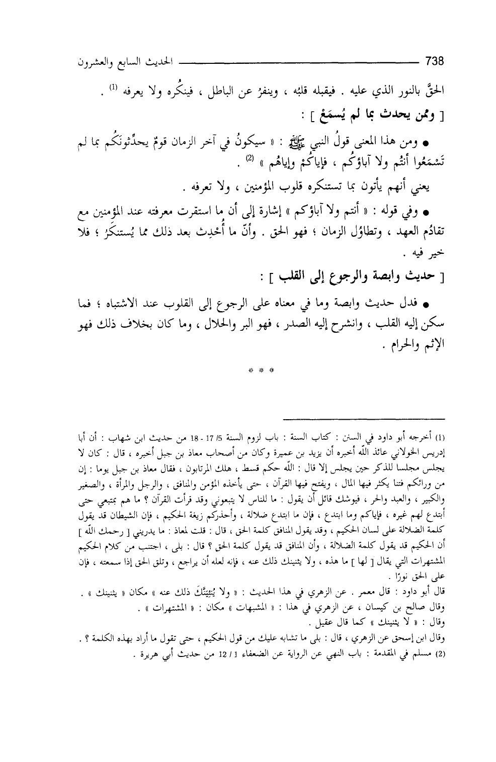 فدلَّ حديثُ وابصة وما في معناه على الرجوع إلى القلوب عند الاشتباه، فما إليه سكن القلبُ، وانشرح إليه الصَّدرُ، فهو البرُّ والحلالُ، وما كان خلافَ ... ذلك، فهو الإثم والحرام.