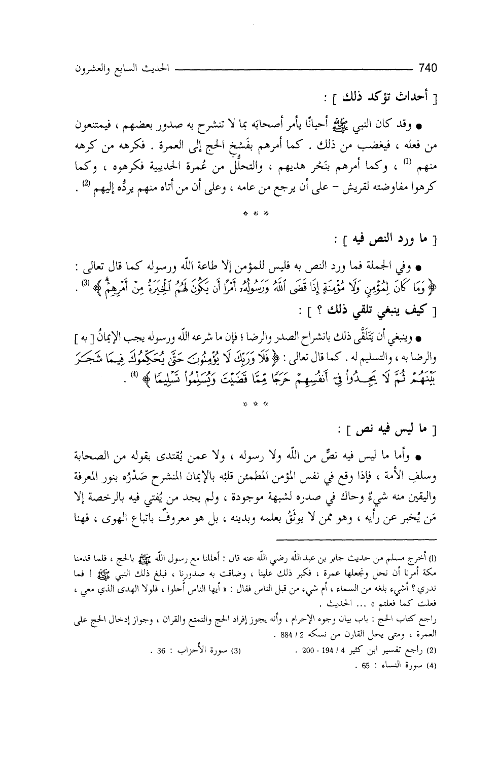 وقد كان النَّبيُّ - صلى الله عليه وسلم - أحياناً يأمرُ أصحابَه بما لا تنشرحُ به صدورُ بعضهم، فيمتنعون من فعله، فيغضب منْ ذلك، كما أمرهم بفسخ الحجِّ إلى العمرة (¬1) ، فكرهه من كرهه منهم، وكما أمرهم بنحرِ هديِهم، والتَّحلُّل من عُمرة الحُديبية، فكرهوه، وكرهوا مقاضاتَه لقريش على أنْ يَرجِعَ من عامِه، وعلى أنَّ من أتاه منهم يردُّه إليهم (¬2) .