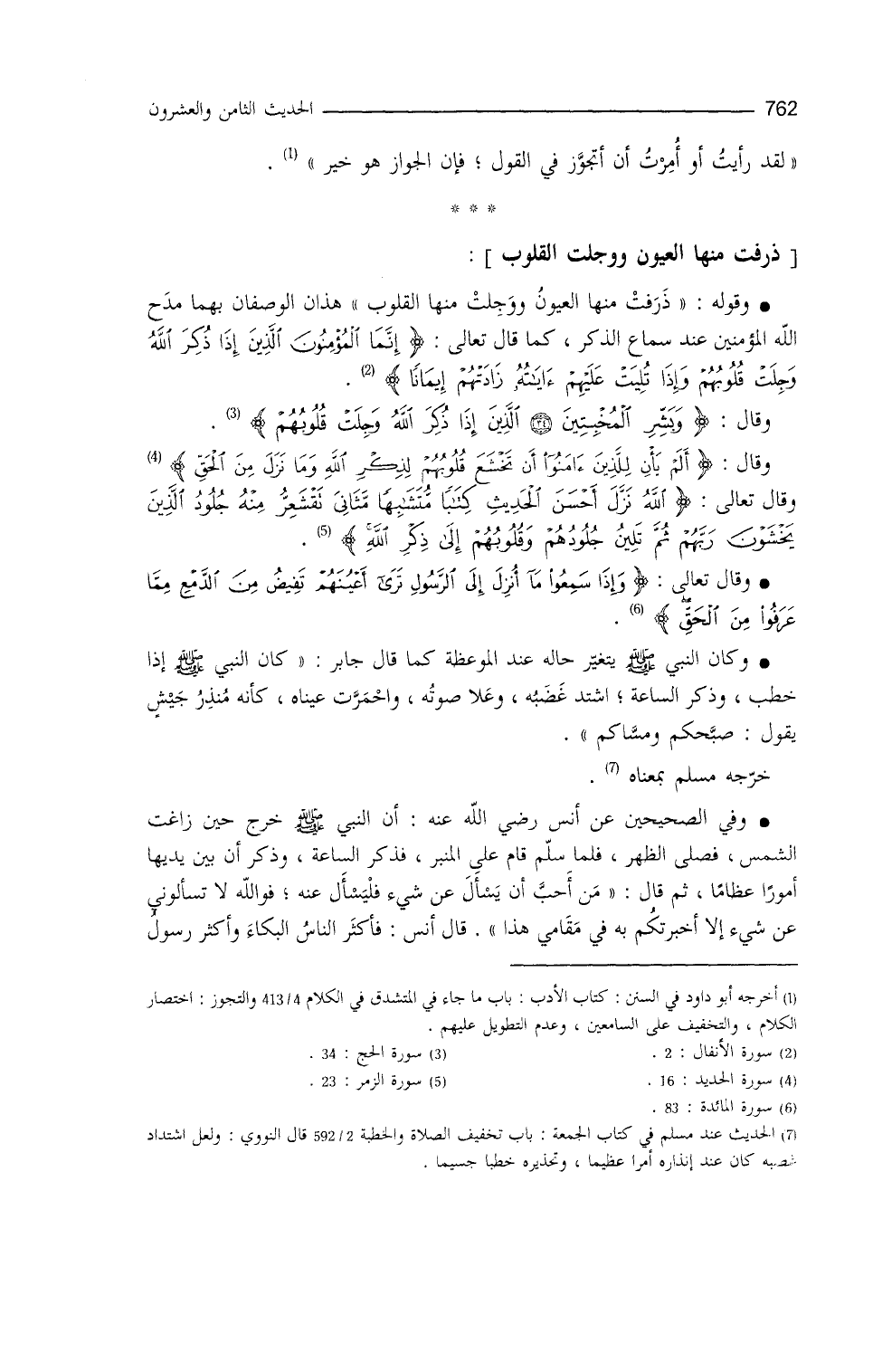 وقوله: ((ذرفت منها العيونُ ووَجِلت منها القلوب)) هذان الوصفان بهما مدح الله المؤمنين عندَ سماع الذكر كما قال تعالى: {إِنَّمَا الْمُؤْمِنُونَ الَّذِينَ إِذَا ذُكِرَ اللهُ وَجِلَتْ قُلُوبُهُمْ} (¬1) ، وقال: {وَبَشِّرِ الْمُخْبِتِينَ الَّذِينَ إِذَا ذُكِرَ اللهُ وَجِلَتْ قُلُوبُهُمْ} (¬2) ، وقال: {أَلَمْ يَأْنِ لِلَّذِينَ آمَنُوا أَنْ تَخْشَعَ قُلُوبُهُمْ لِذِكْرِ اللهِ وَمَا نَزَلَ مِنَ الْحَقِّ} (¬3) ، وقال: {اللهُ نَزَّلَ أَحْسَنَ الْحَدِيثِ كِتَاباً مُتَشَابِهاً مَثَانِيَ تَقْشَعِرُّ مِنْهُ جُلُودُ الَّذِينَ يَخْشَوْنَ رَبَّهُمْ ثُمَّ تَلِينُ جُلُودُهُمْ وَقُلُوبُهُمْ إِلَى ذِكْرِ