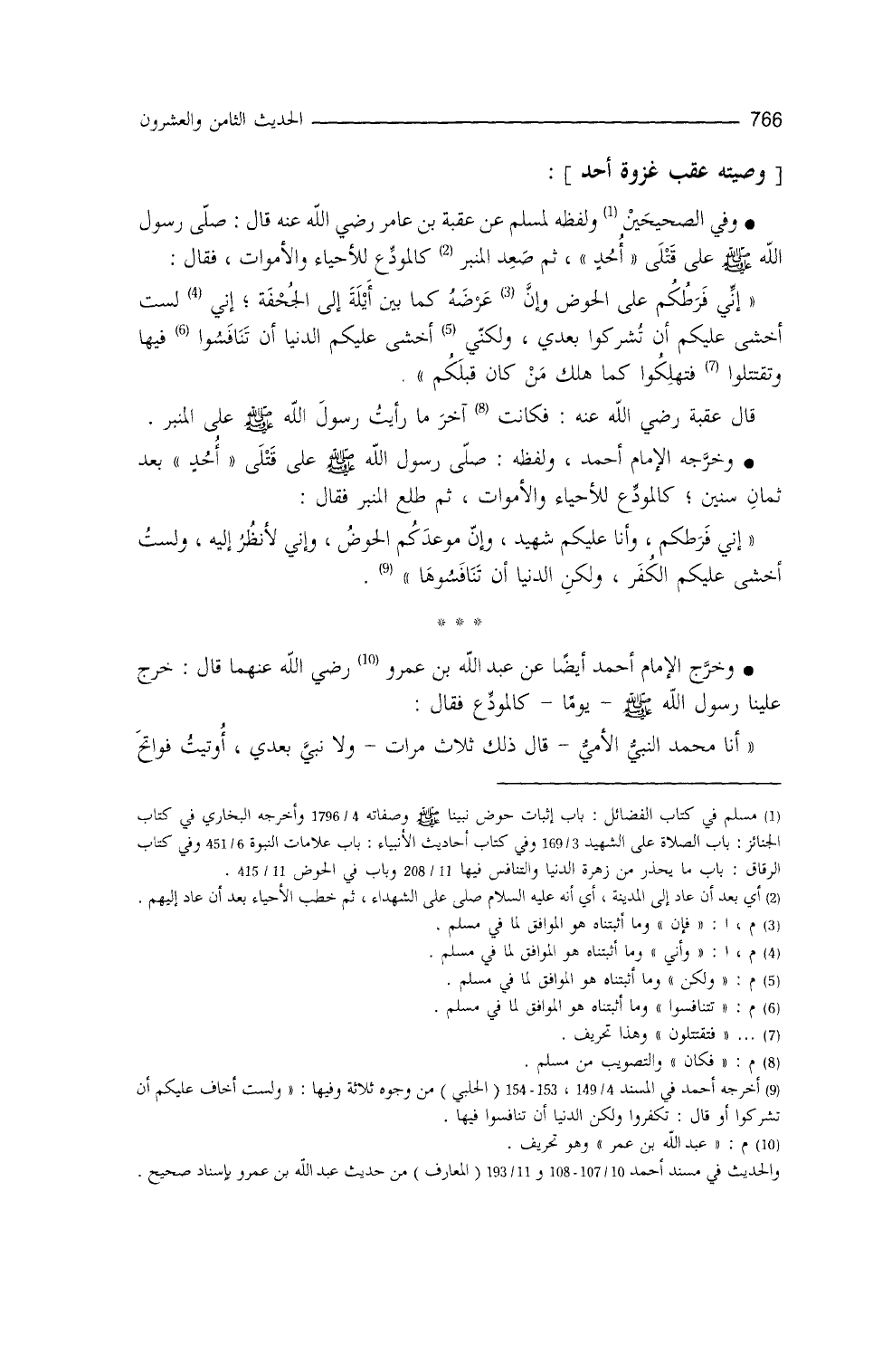 ولفظه: صلَّى رسولُ الله - صلى الله عليه وسلم - على قتلى أُحُدٍ بعد ثمانِ سنين كالمودِّع للأحياء والأموات، ثم طلَعَ المنبرَ، فقال: ((إنِّي فرطُكم، وأنا عليكم شهيد، وإنَّ موعدَكم الحوضُ، وإنِّي لأنظرُ إليه، ولستُ أخشى عليكم الكُفر، ولكن الدُّنيا أنْ تنافسوها)) .
